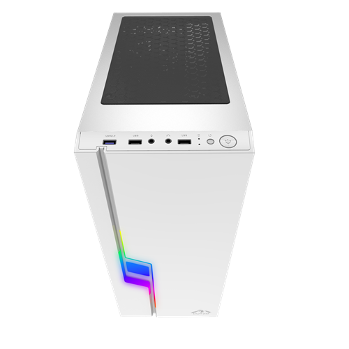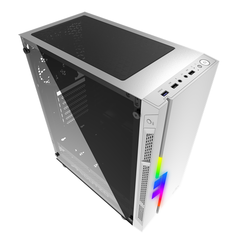 Miditower, ATX, no power supply (supports ATX up to 180 mm long), front with RGB switch, 2 x USB 2.0, 1 x USB 3.0 & audio connections, 2 x 2.5" / 2 x 3.5" drive bays, watercooling: supports up to 240mm radiator, GPU clearance: 31 cm, maximum CPU cooler height: 16 cm, included case fans: 1 x 120mm rear, with tempered glass side window, white with RGB