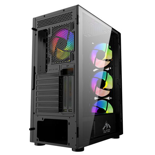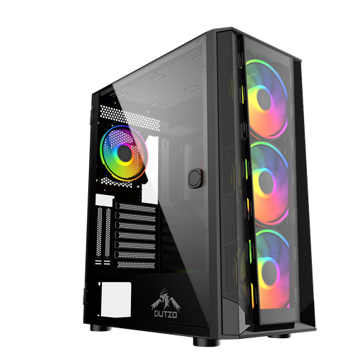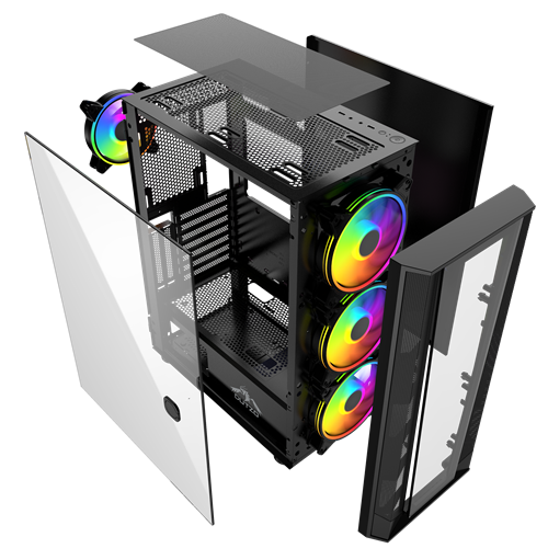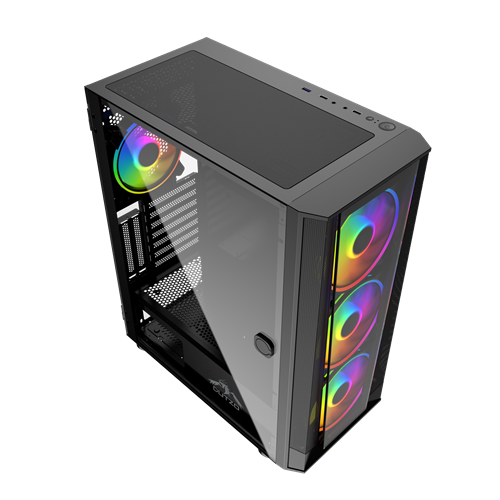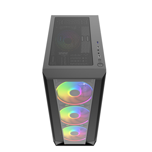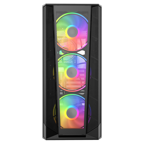 With 3x powerful ARGB 140mm front fans and a large mesh area it delivers exceptional airflow. In the back it features a 4th ARGB RGB fan. All four fans can be controlled by either your favorite software or by the RGB button at the top.