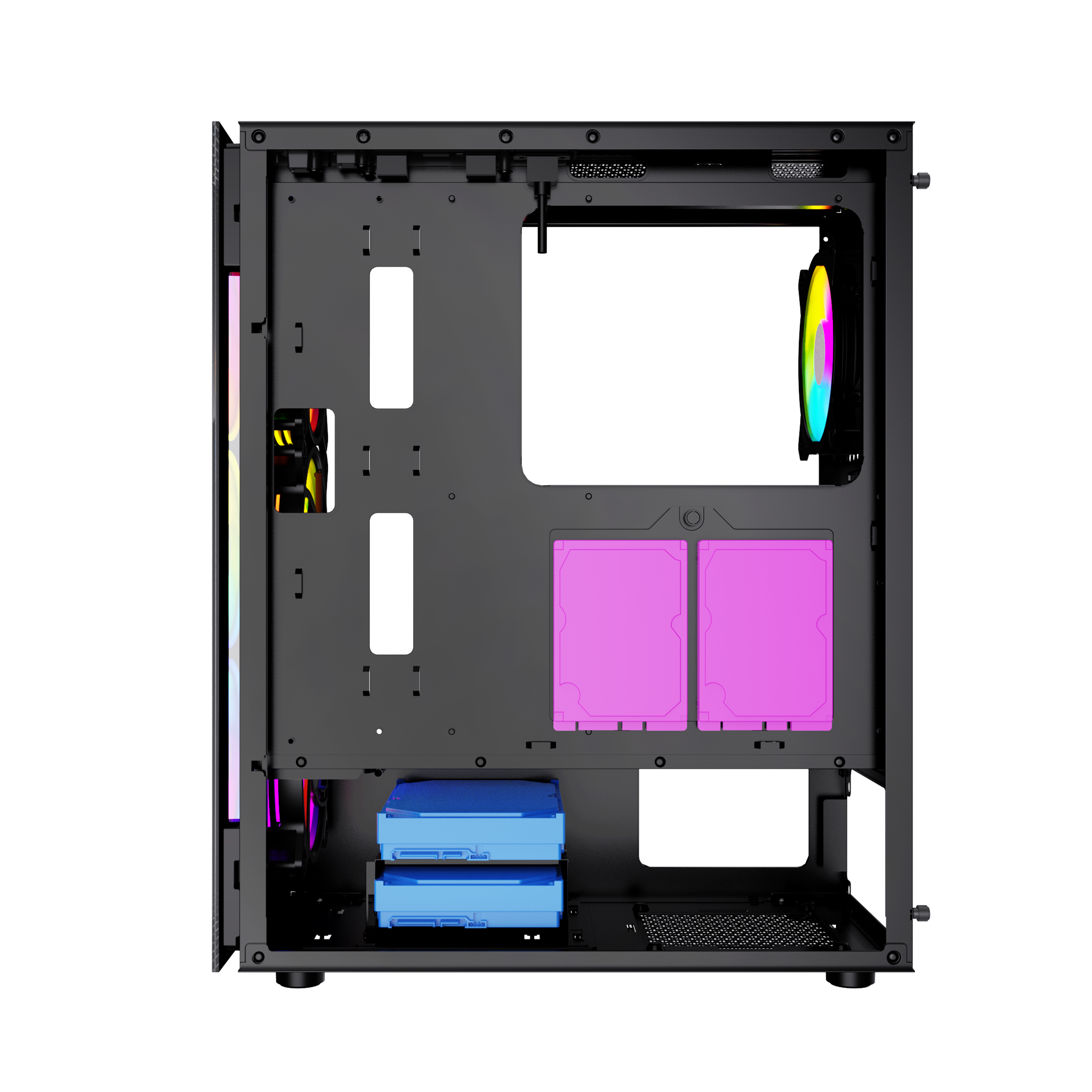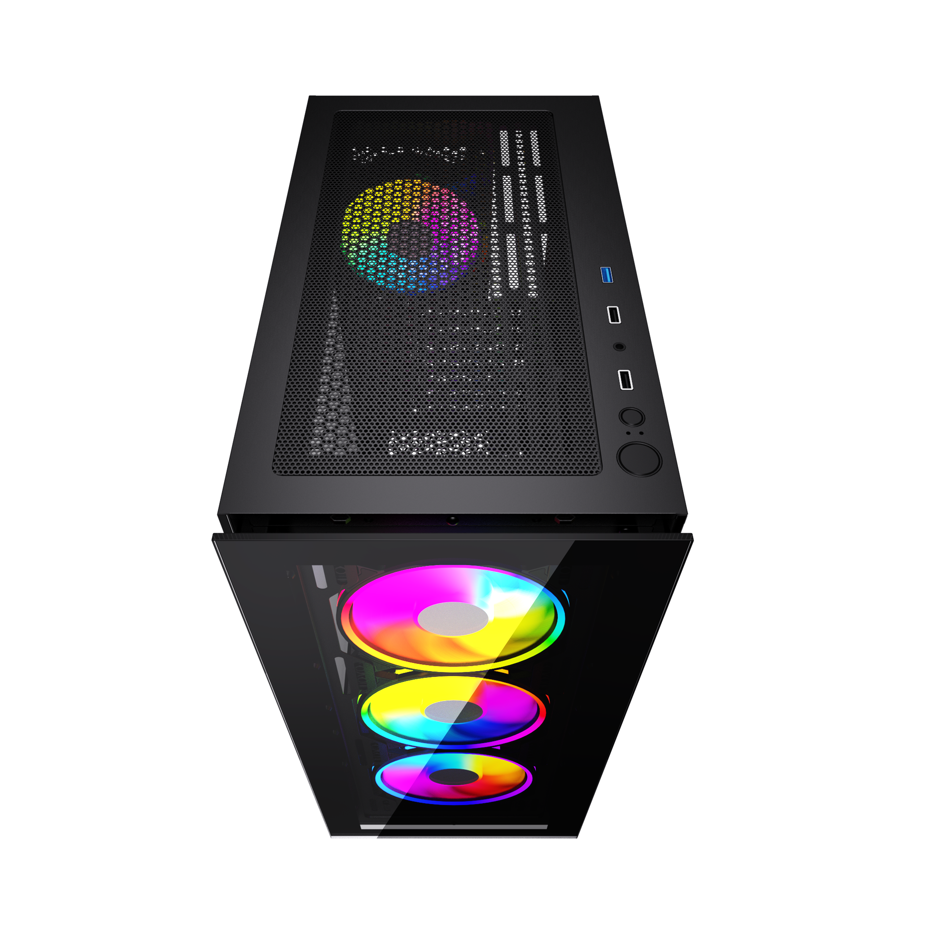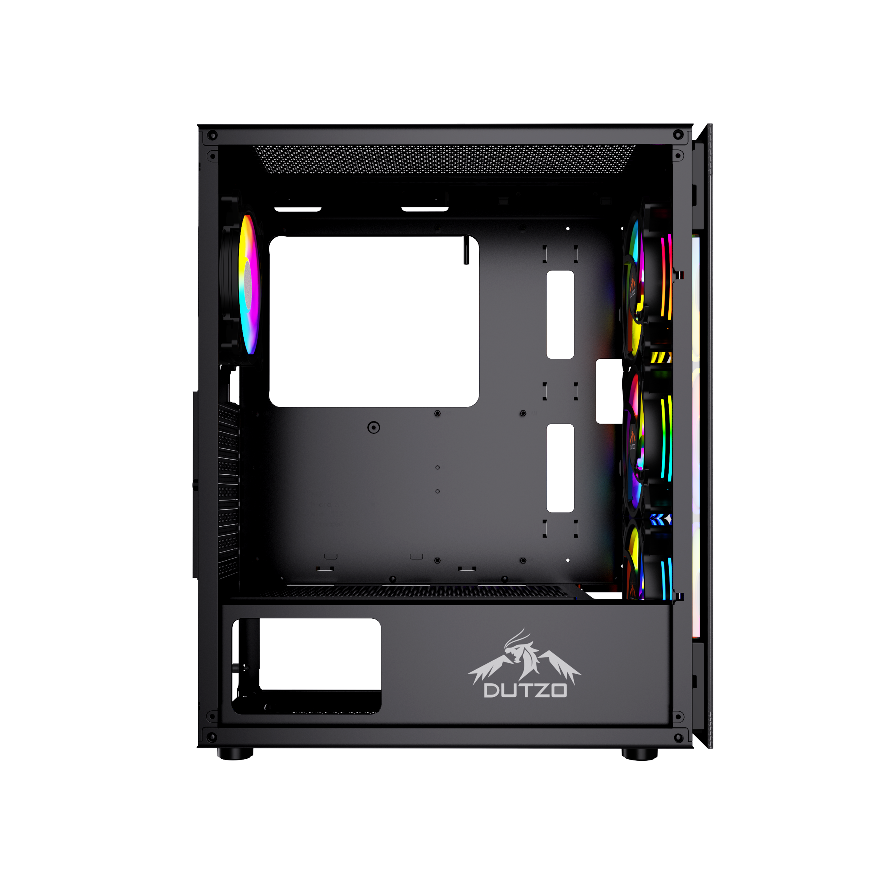Miditower, ATX, no power supply (supports ATX up to 170mm long), front with RGB switch, 1 x USB 2.0, 1 x USB 3.0 & audio connections, 2 x 2.5" / 2 x 2.5"/3.5" drive bays, RGB Controller, watercooling: supports up to 360mm radiator, GPU clearance: 33 cm, CPU cooler clearance: 165 mm, included case fans: 3 x 120mm front (RGB LED) / 1 x 120mm rear (RGB LED), with tempered glass side window & front, black with RGB DUTZO C530 is packed with 4 x RGB 120mm fans connected to our ARGB controller -