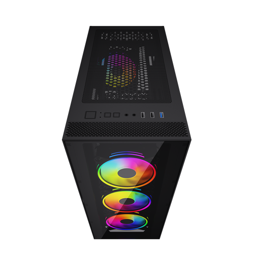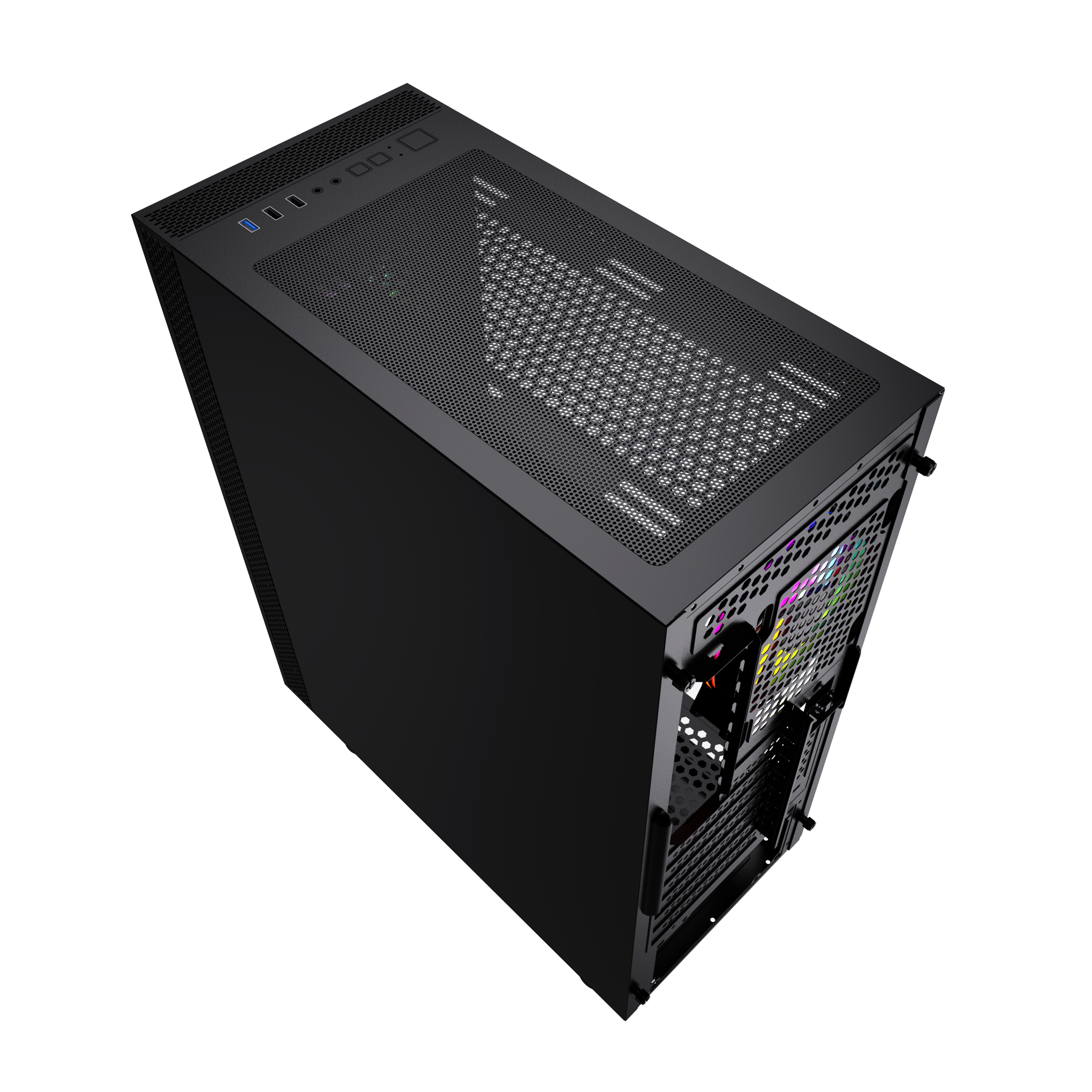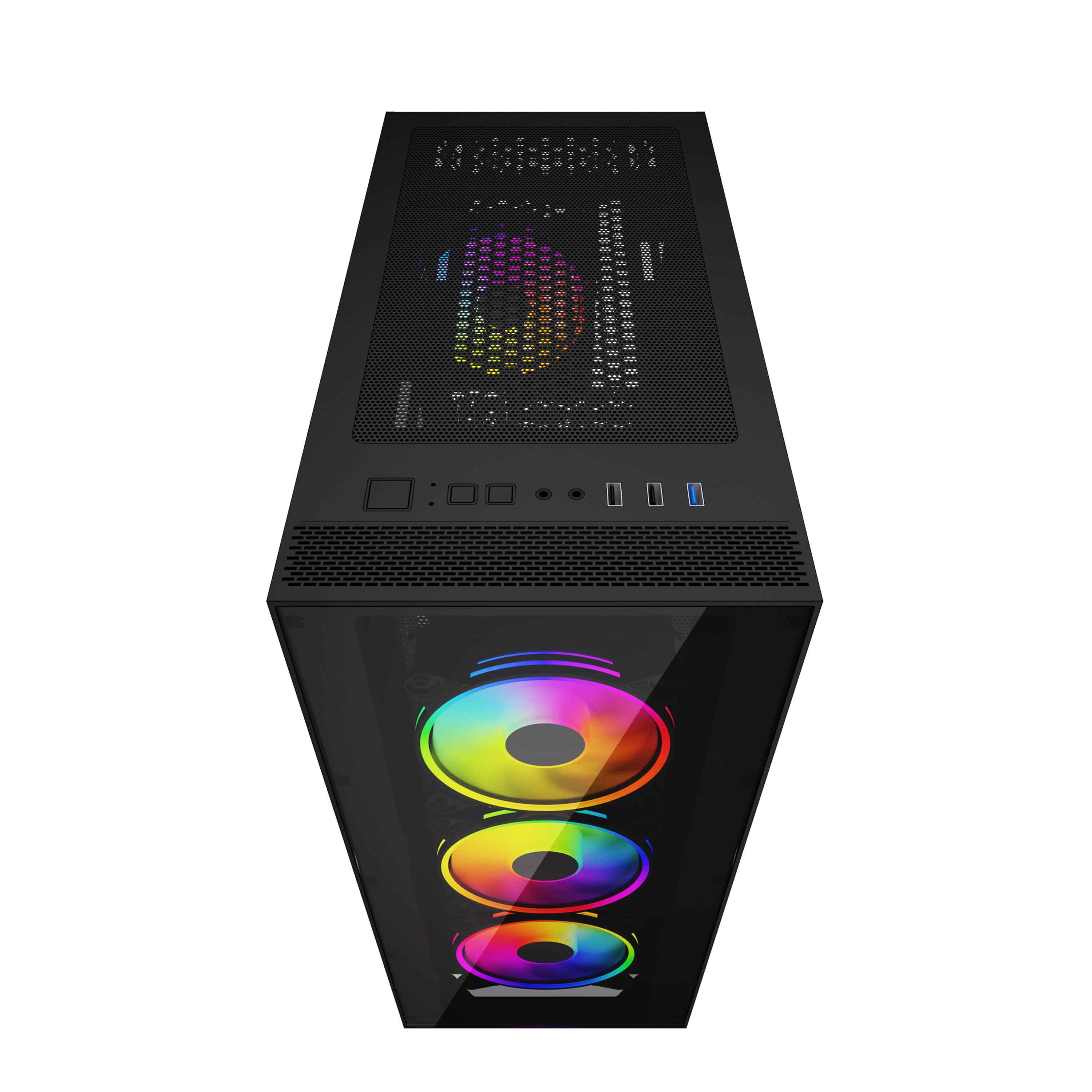 Miditower, ATX, no power supply (supports ATX up to 180mm long), front with RGB switch, 1 x USB 2.0, 1 x USB 3.0 & audio connections, 2 x 2.5" / 2 x 2.5"/3.5" drive bays, RGB Controller, watercooling: supports up to 360mm radiator, GPU clearance: 34 cm, CPU cooler clearance: 165 mm, included case fans: 3 x 120mm front (RGB LED) / 1 x 120mm rear (RGB LED), with tempered glass side window & front, black with RGB