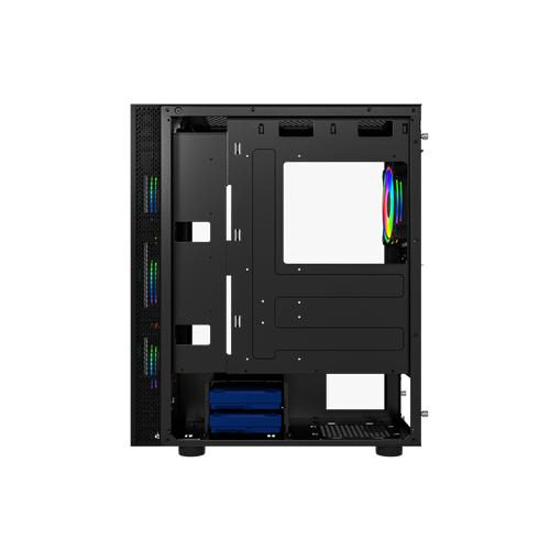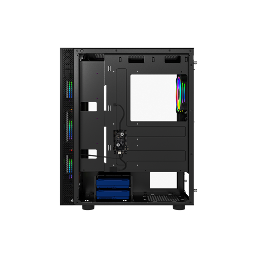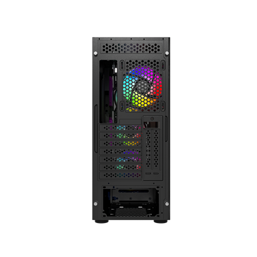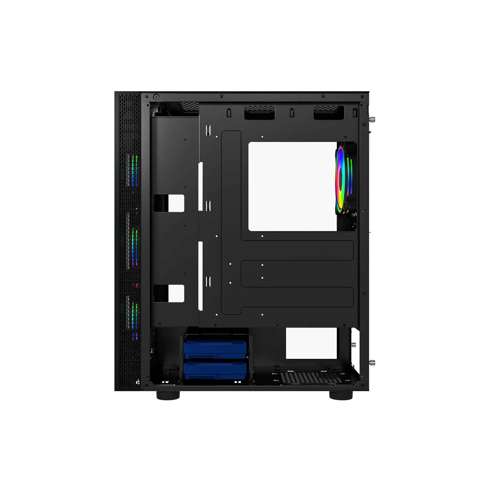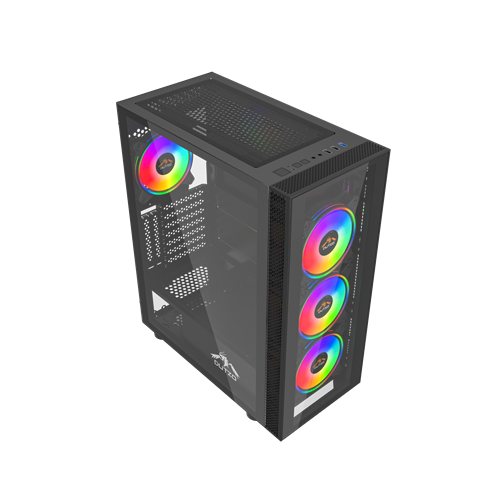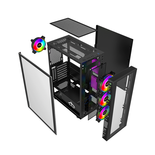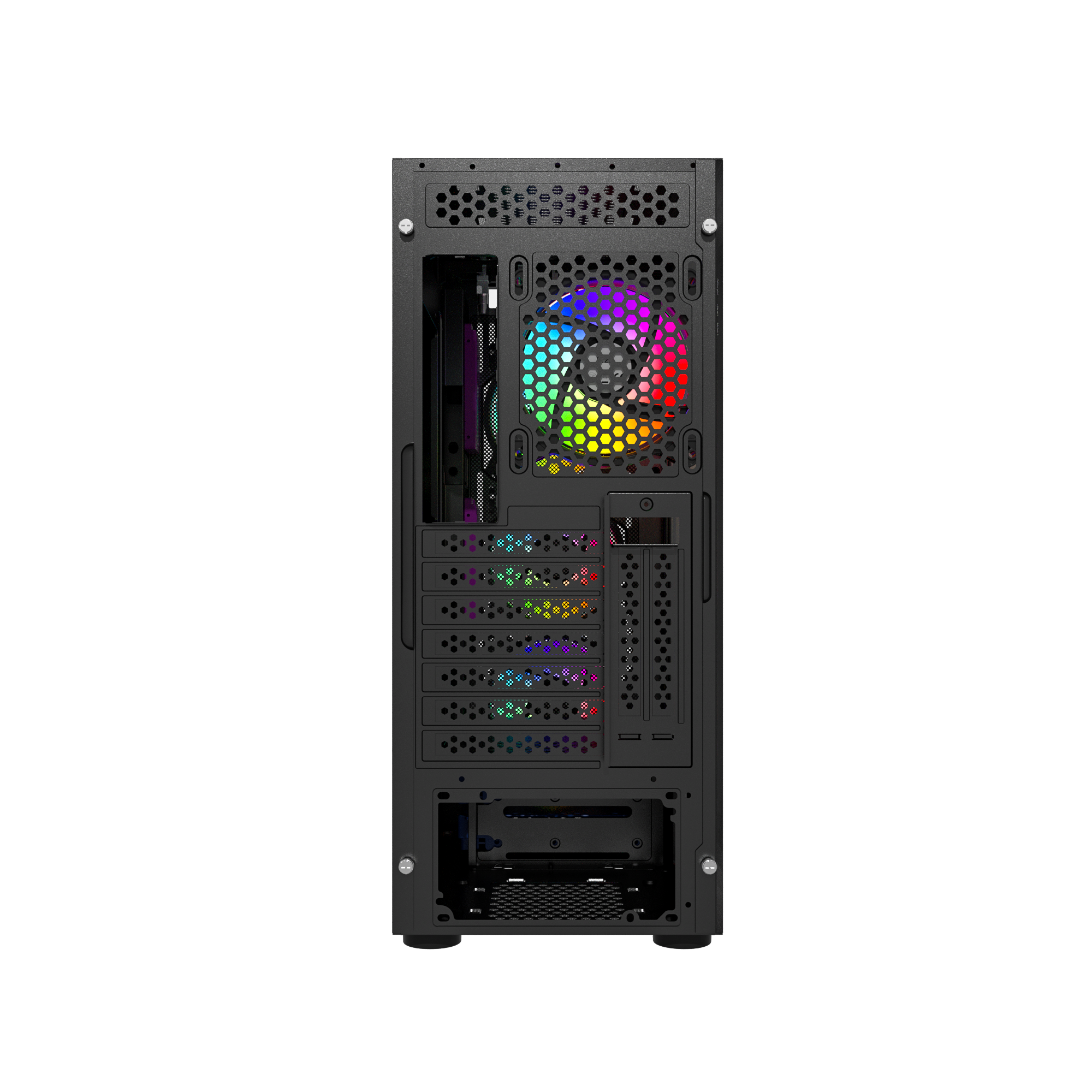 Miditower, ATX, no power supply (supports ATX up to 180mm long), front with RGB switch, 1 x USB 2.0, 1 x USB 3.0 & audio connections, 2 x 2.5" / 2 x 2.5"/3.5" drive bays, RGB Controller, watercooling: supports up to 360mm radiator, GPU clearance: 34 cm, CPU cooler clearance: 165 mm, included case fans: 3 x 120mm front (RGB LED) / 1 x 120mm rear (RGB LED), with tempered glass side window & front, black with ARGB (ARGB controlable with ASUS AURA, Gigabyte Fusion RGB 2.0, MSI Mystic Light and Asrock Polychrome)