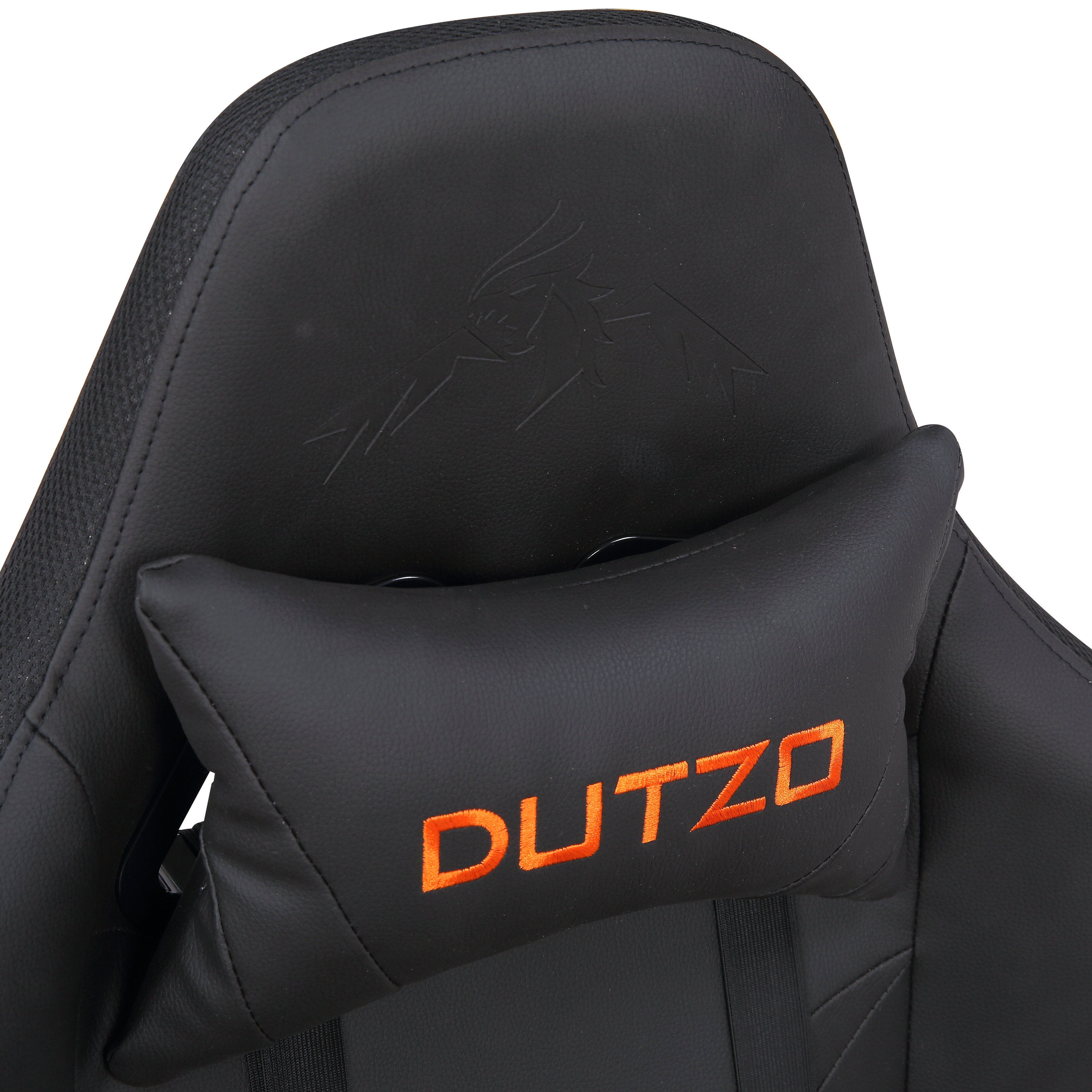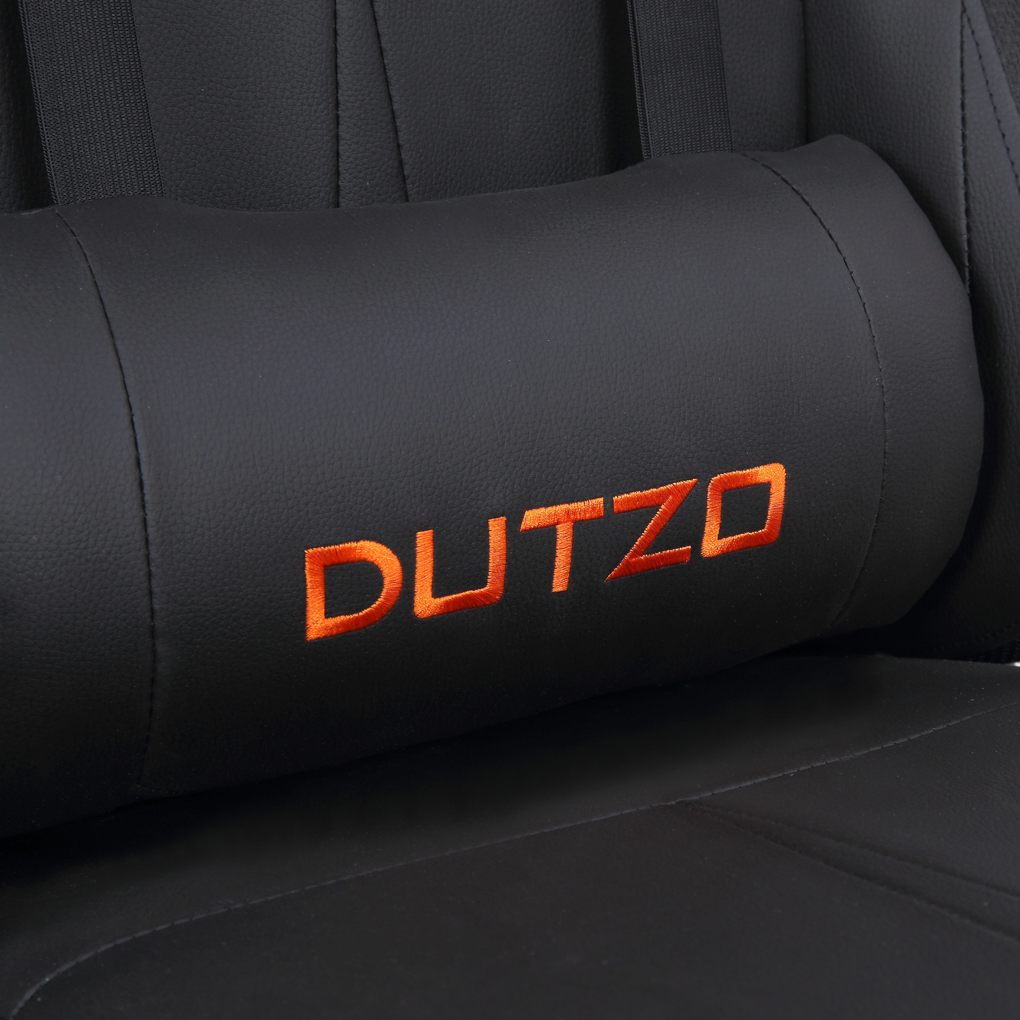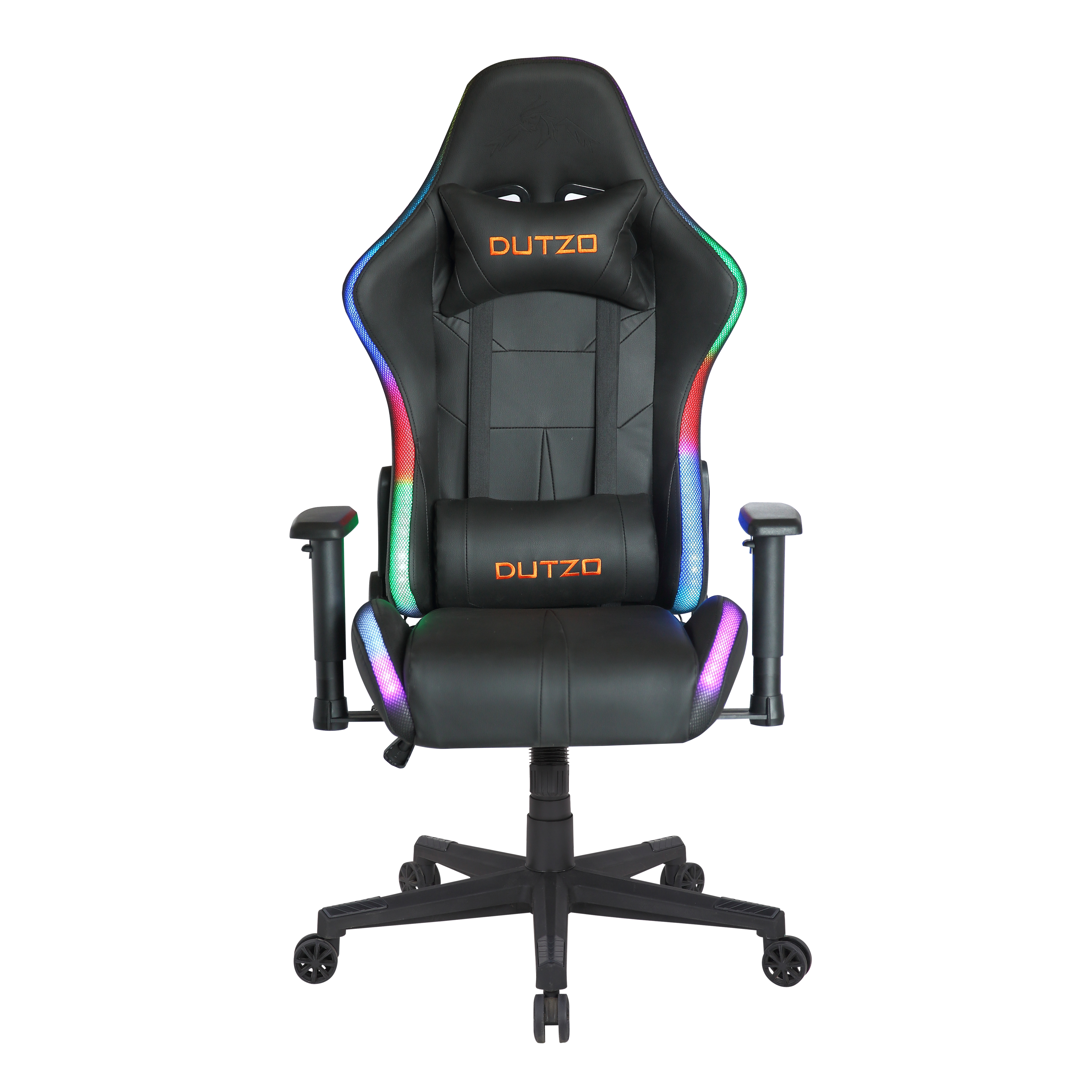 Gaming chair with great ergonomic design amd RGB Lights, including soft padded headrest and lower back pillows. The E-Sport V2 RGB is the successor to the award winning E-Sport model and is now upgraded with a taller gas lift, so it remains as a smaller chair then our other DUTZO models, but keeps the same inspiration from racing chairs with ergonomically designed side edges for supporting your lower back region and shoulders, for better support we've included two pillows allowing you to find your ideal position. E-Sport chairs are sturdy built and ready for many hours gaming your favorite games as it's body is made with a solid metal skeleton, Fabric, double inner stitching, market leading class 4 gas lifts and black nylon base with 60mm wide wheels. E-Sport has 2 dimensional armrests, is tiltable with 30 degrees and the backrest can be angled 90 degrees, so you definitely find your own seat position for many hours of gaming or even a fast nap between gaming sessions! Height adjustable with 10 cm high gas cartridge (larger gas cartridges are available). The E-Sport is recommended for people up to 185 cm high and max 120 kg is supported.