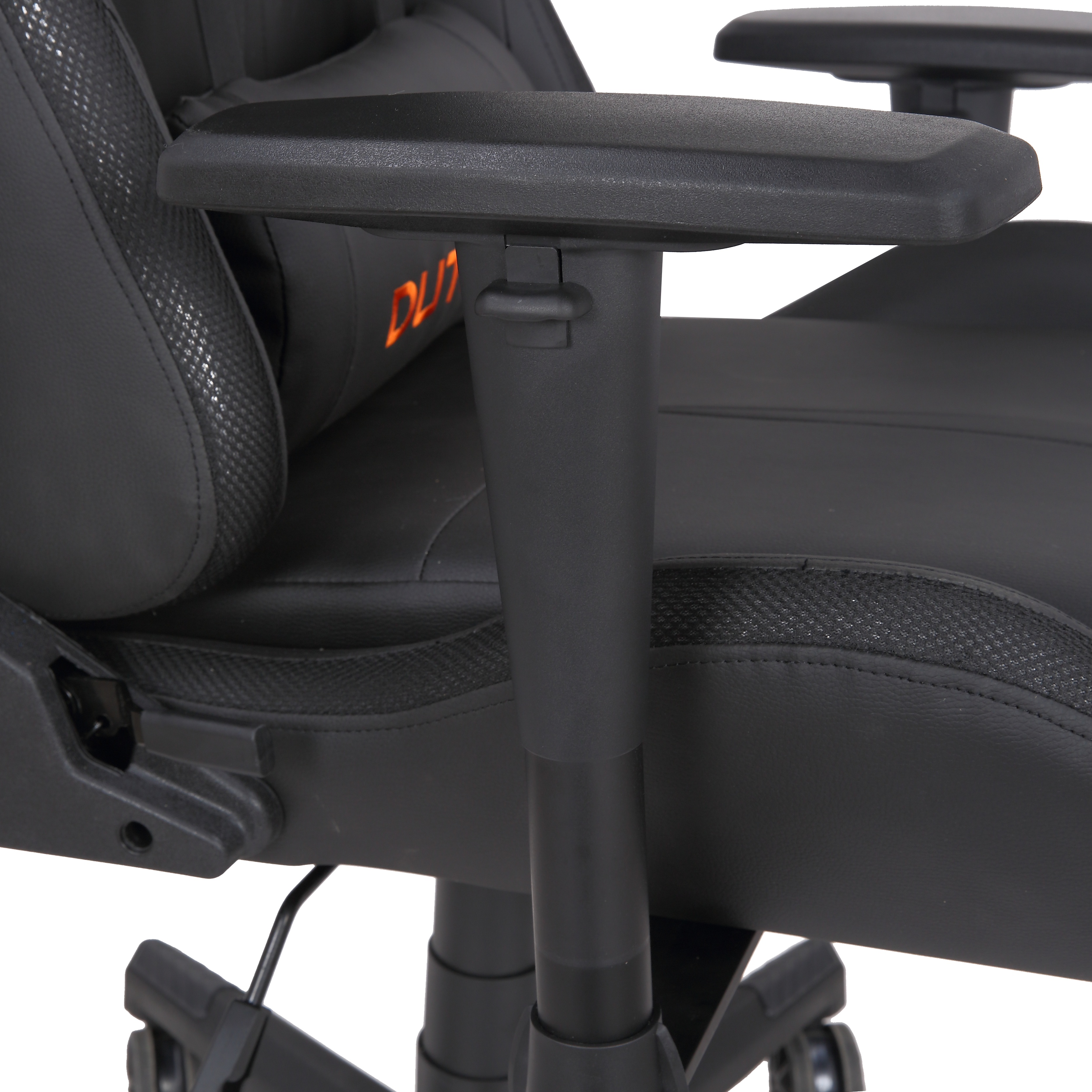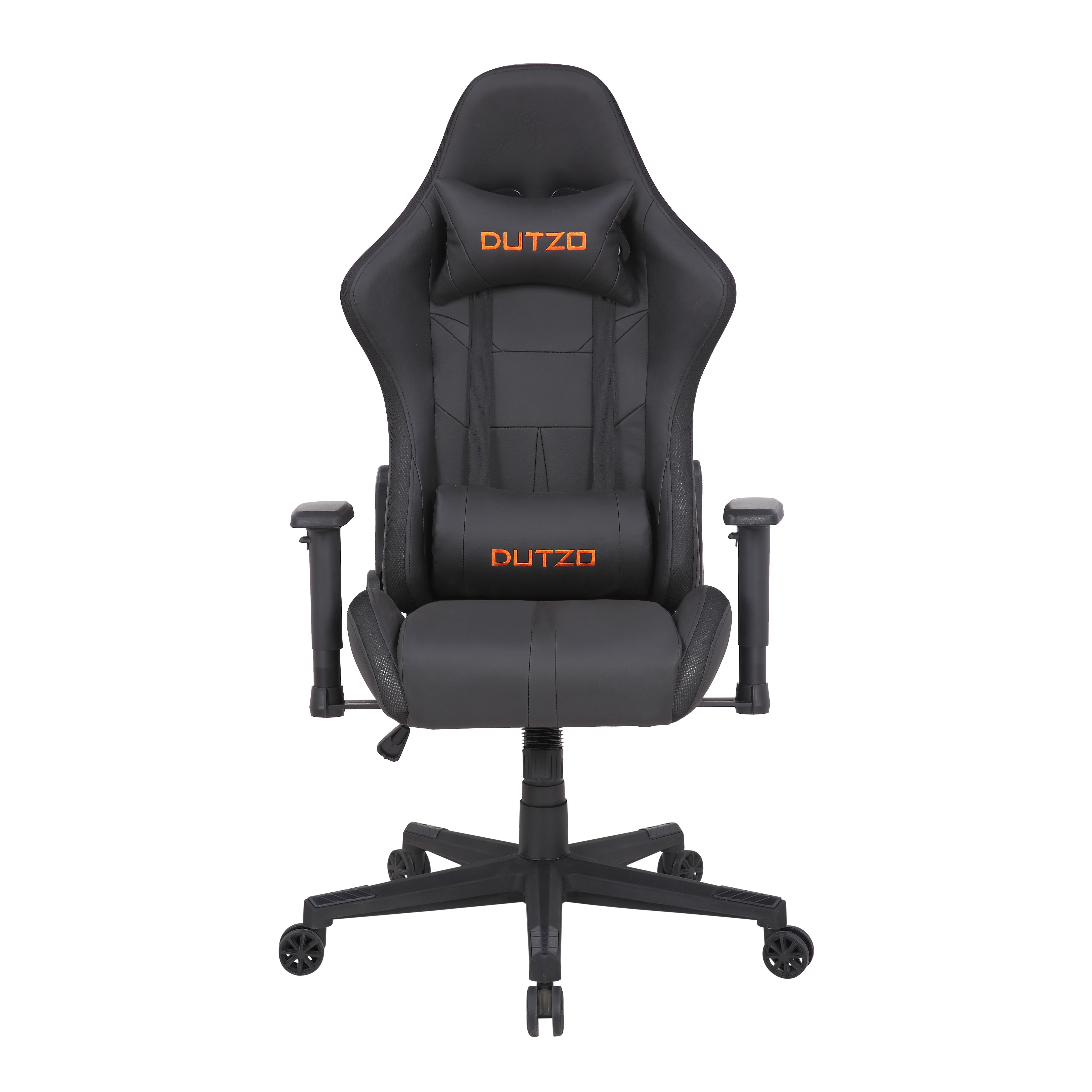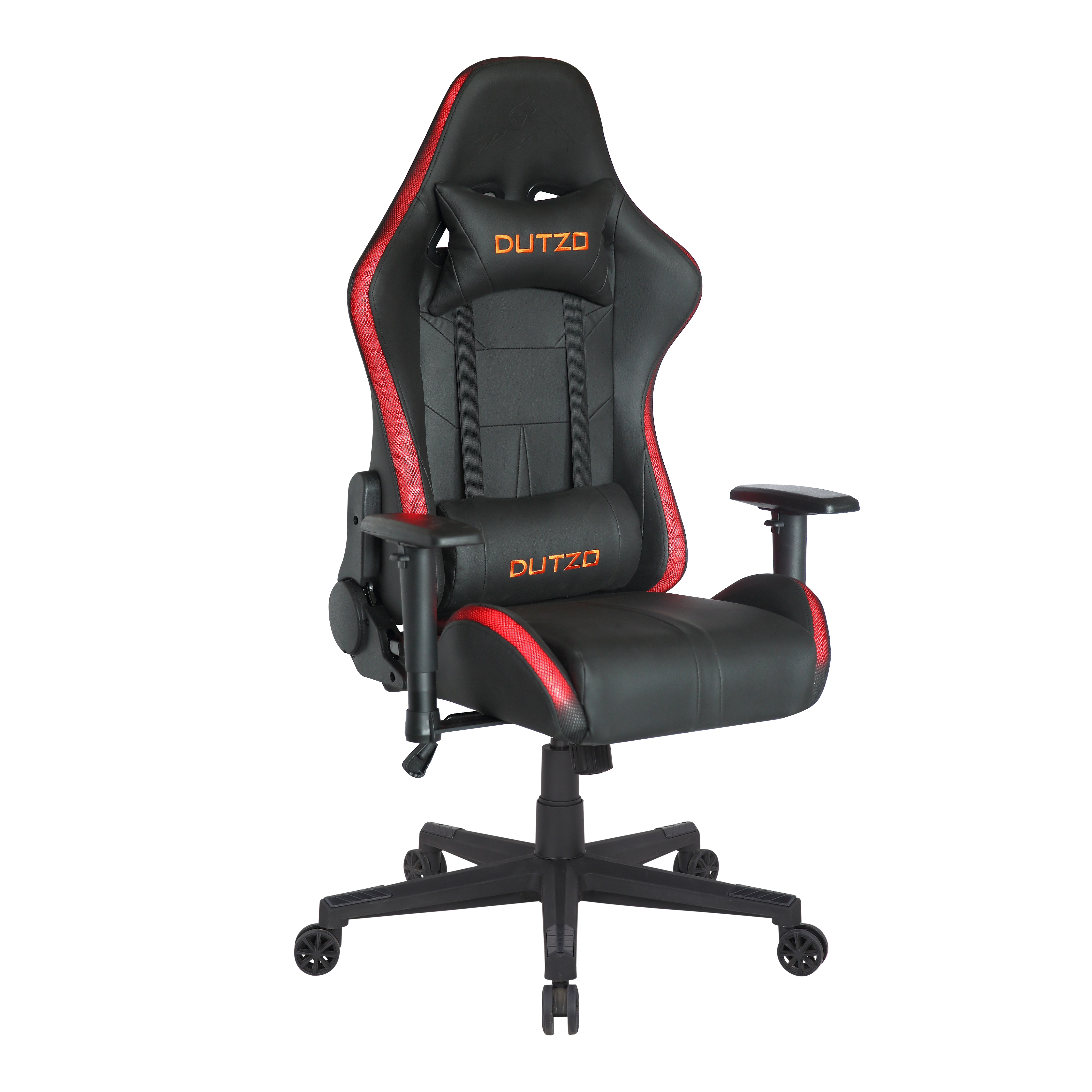 Gaming chair with great ergonomic design amd RGB Lights, including soft padded headrest and lower back pillows. The E-Sport V2 RGB is the successor to the award winning E-Sport model and is now upgraded with a taller gas lift, so it remains as a smaller chair then our other DUTZO models, but keeps the same inspiration from racing chairs with ergonomically designed side edges for supporting your lower back region and shoulders, for better support we've included two pillows allowing you to find your ideal position. E-Sport chairs are sturdy built and ready for many hours gaming your favorite games as it's body is made with a solid metal skeleton, Fabric, double inner stitching, market leading class 4 gas lifts and black nylon base with 60mm wide wheels. E-Sport has 2 dimensional armrests, is tiltable with 30 degrees and the backrest can be angled 90 degrees, so you definitely find your own seat position for many hours of gaming or even a fast nap between gaming sessions! Height adjustable with 10 cm high gas cartridge (larger gas cartridges are available). The E-Sport is recommended for people up to 185 cm high and max 120 kg is supported.