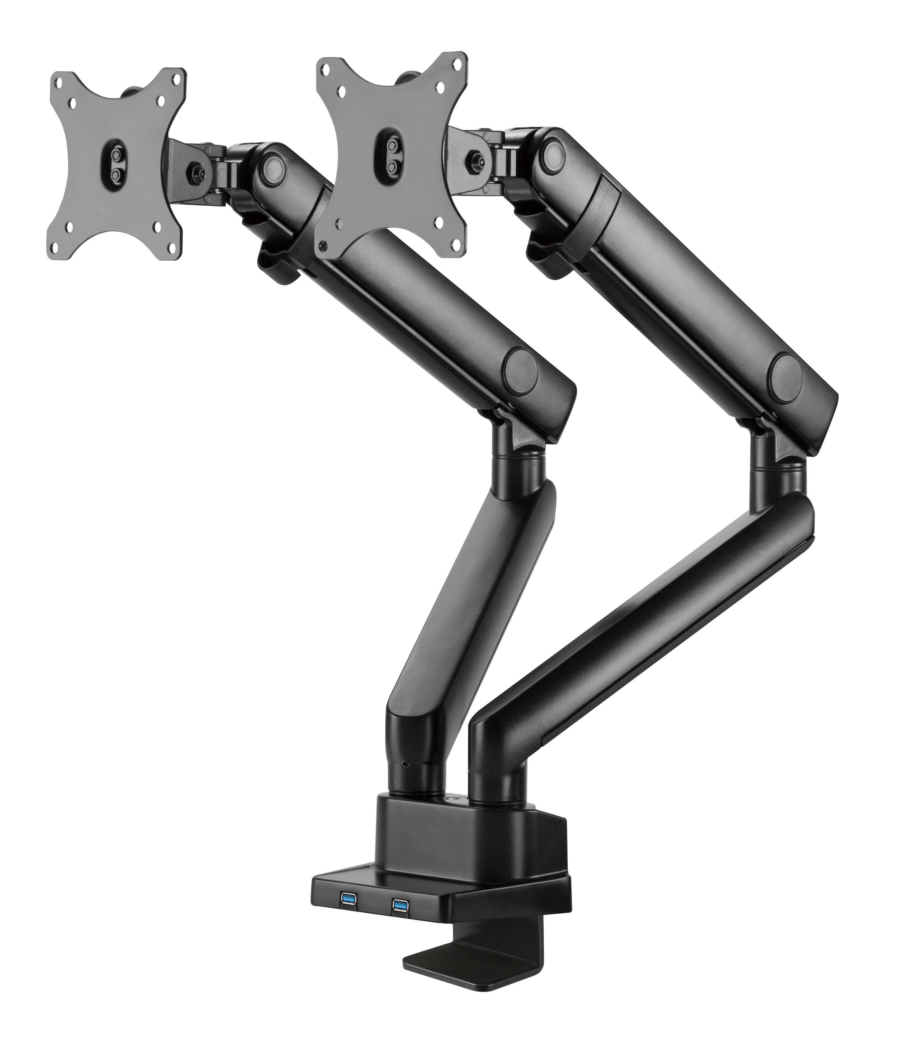 Flexible VESA Monitor Arm for 2 screens, suitable for screens between 17" and 32", max load per screen: 8 kg, supports VESA standards: 75x75 and 100x100, with 2 x USB A ports (requires connection to PC via 2 x USB A ports), gray / black design.