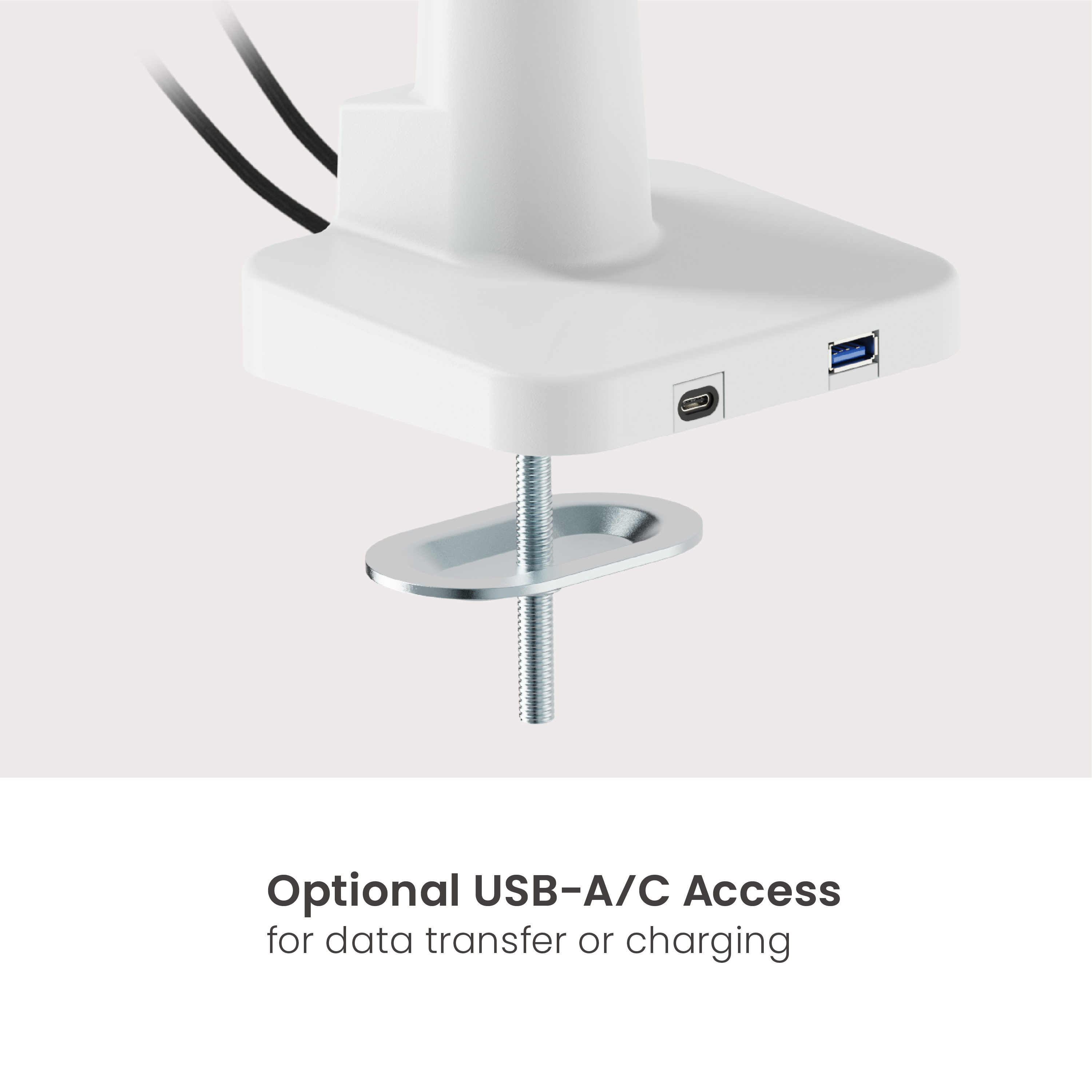 The built-in USB-A and USB-C ports located at the base of the arm offer quick and convenient access for charging devices or connecting peripherals. Whether you're working from home, at the office, or gaming for hours, the DUTZO Heavy Duty Deluxe Monitor Arm brings both form and function to your desktop environment. Available in two colors, black and white.