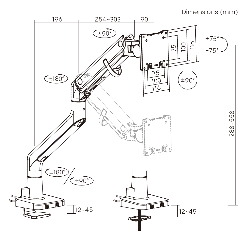 Designed for modern work and gaming setups, this premium monitor arm combines advanced functionality with a clean, minimalist aesthetic. With its gas spring counterbalance mechanism, it allows you to easily adjust your monitor's height and angle for maximum comfort and productivity throughout the day.
