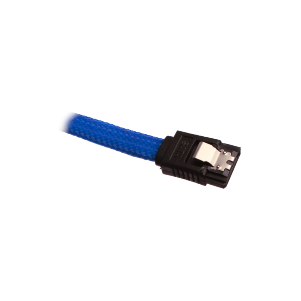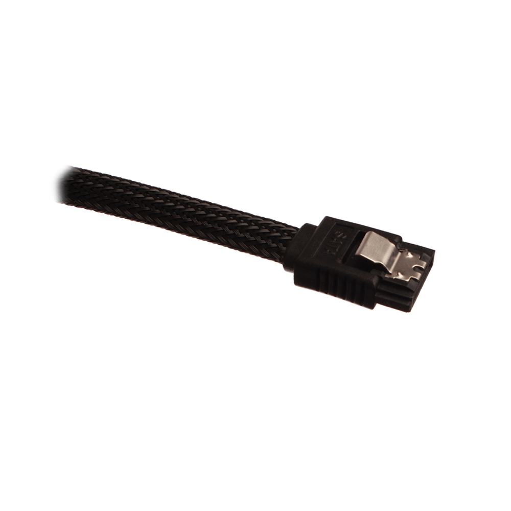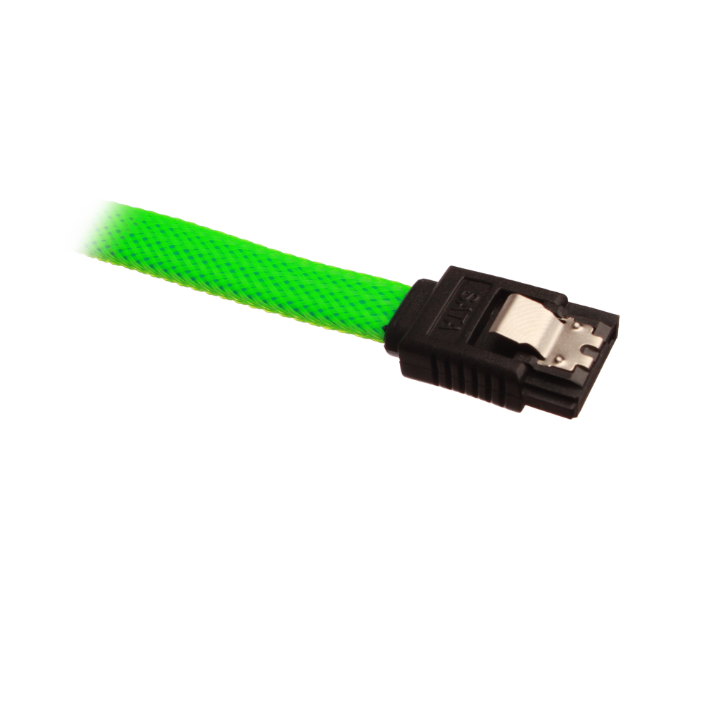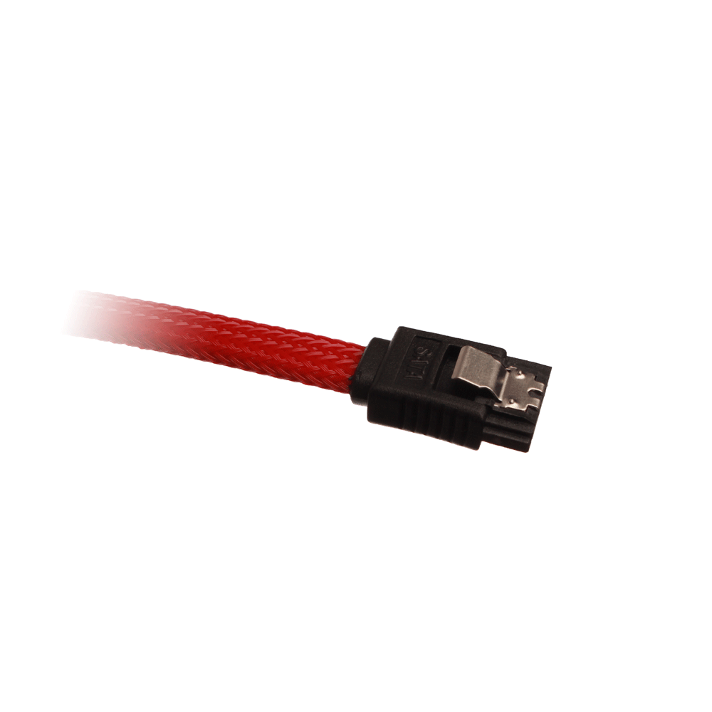 Sleeved SATA cable with clip lock, supports SATA-I (SATA-150) / SATA-II (SATA-300) & SATA-III (SATA-600), works with all mechanical harddrives, SSD's and optical drives (CD / DVD / BlueRay-drev) with a SATA port