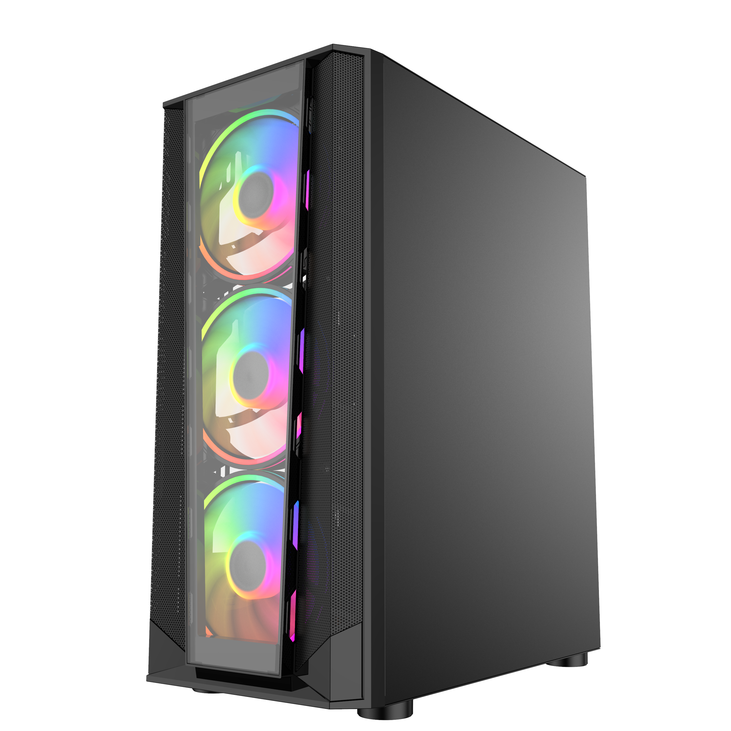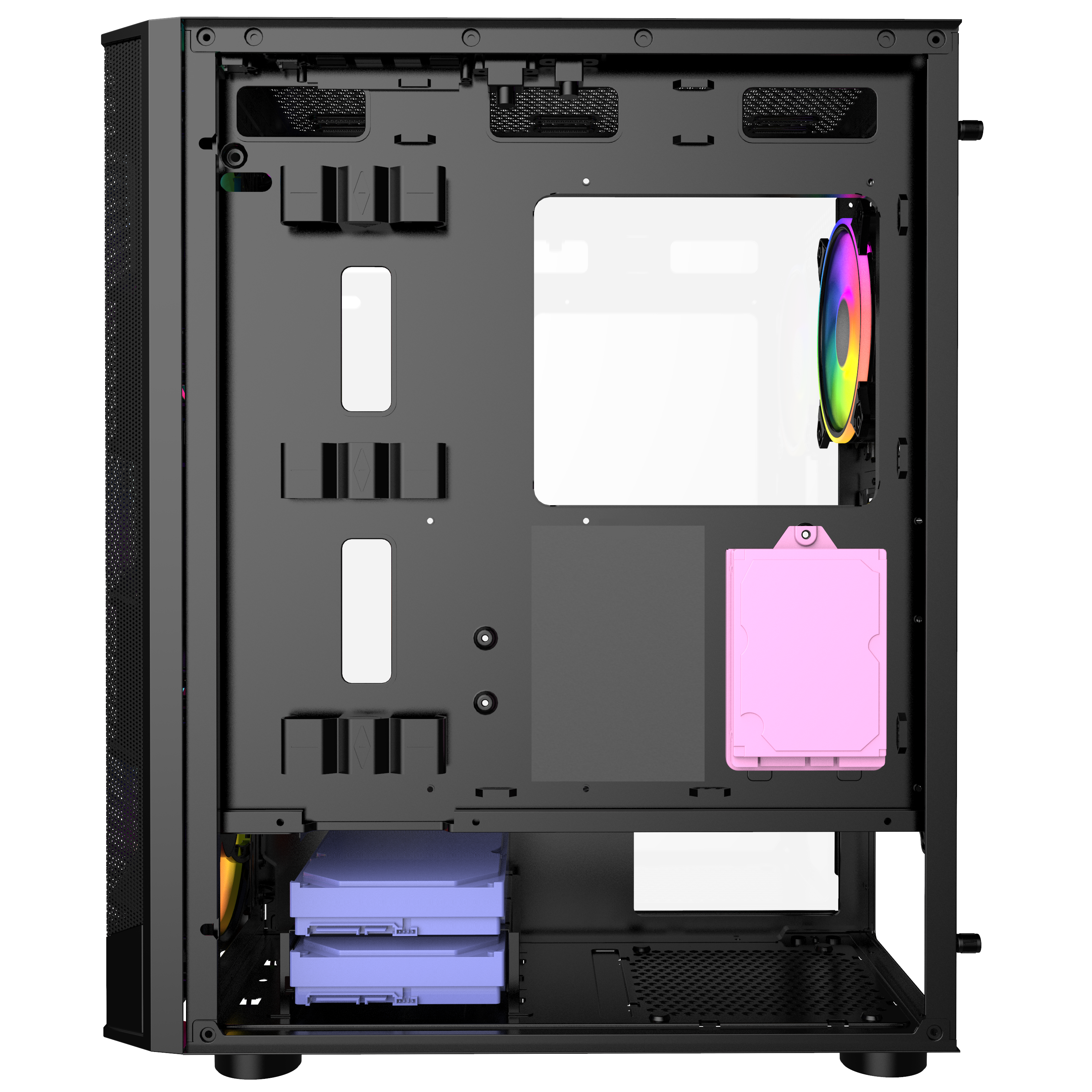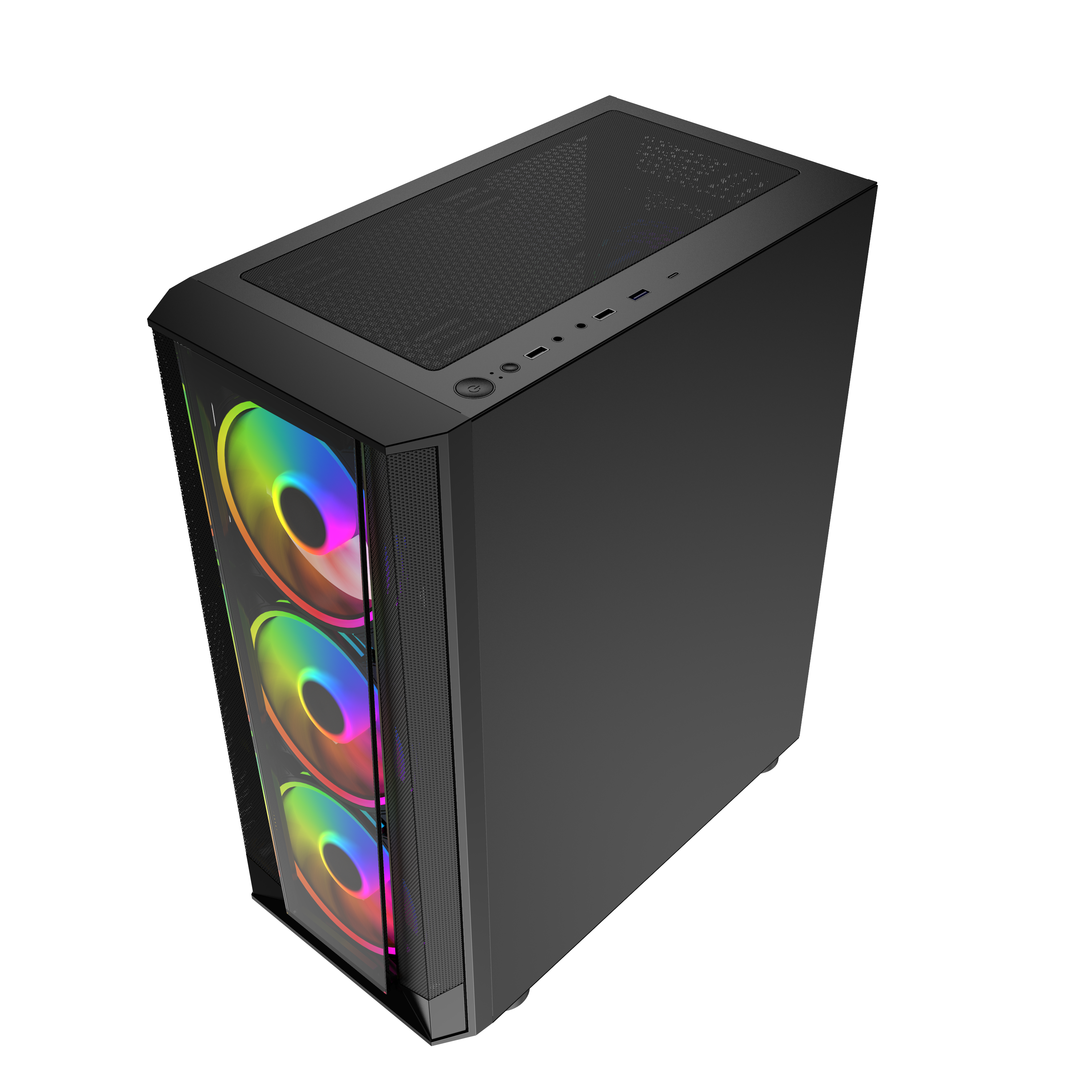 Miditower, ATX, no power supply (supports ATX up to 210mm long), front with RGB switch, 2 x USB 2.0, 1 x USB 3.0 & audio connections, 2 x 2.5" / 2 x 3.5" drive bays, watercooling: supports up to 360mm radiator in the front and 280mm radiator at top, GPU clearance: 34,5 cm, included case fans: 3 x 140mm front (RGB LED) / 1 x 120mm rear (RGB LED), with tempered glass side window which can open, black with RGB