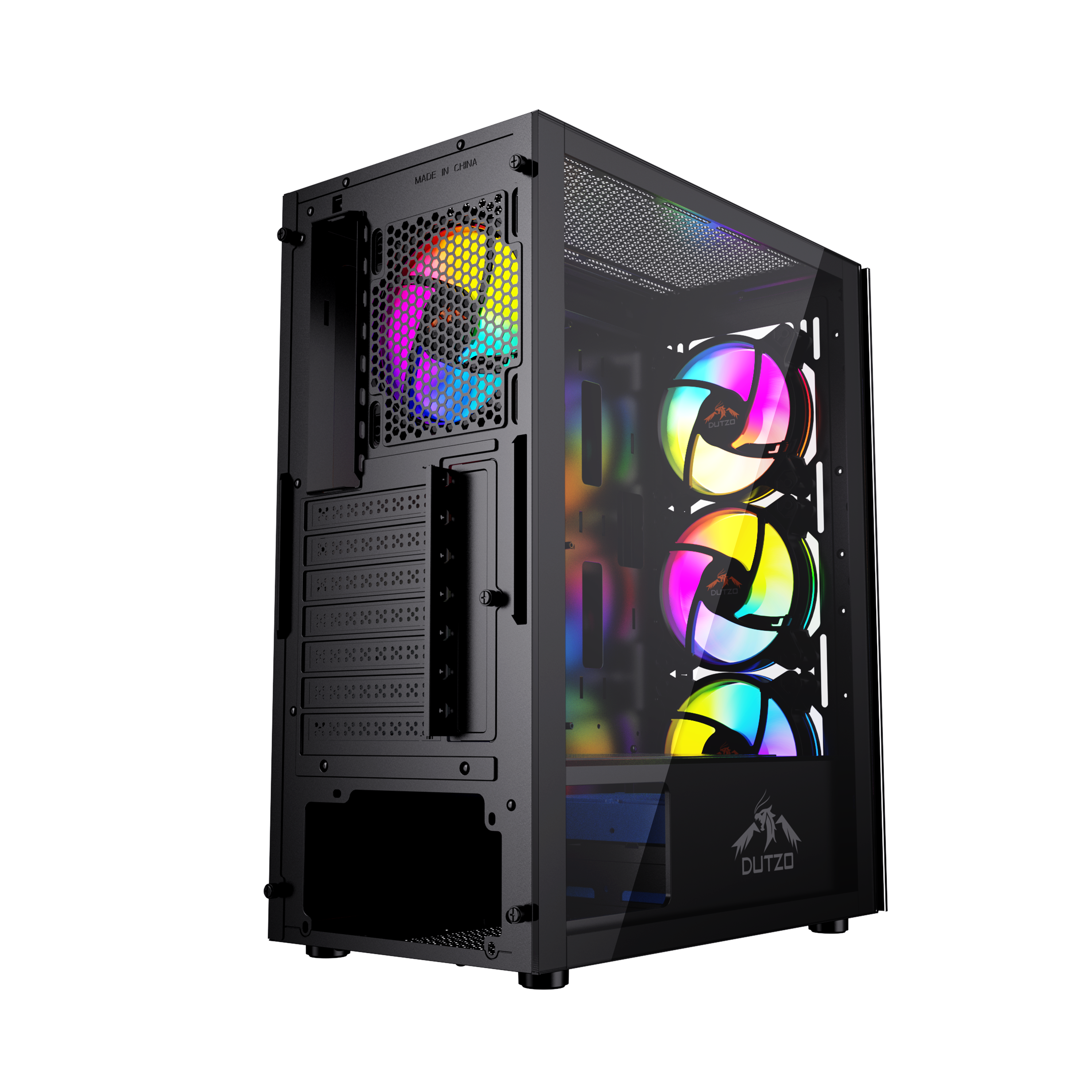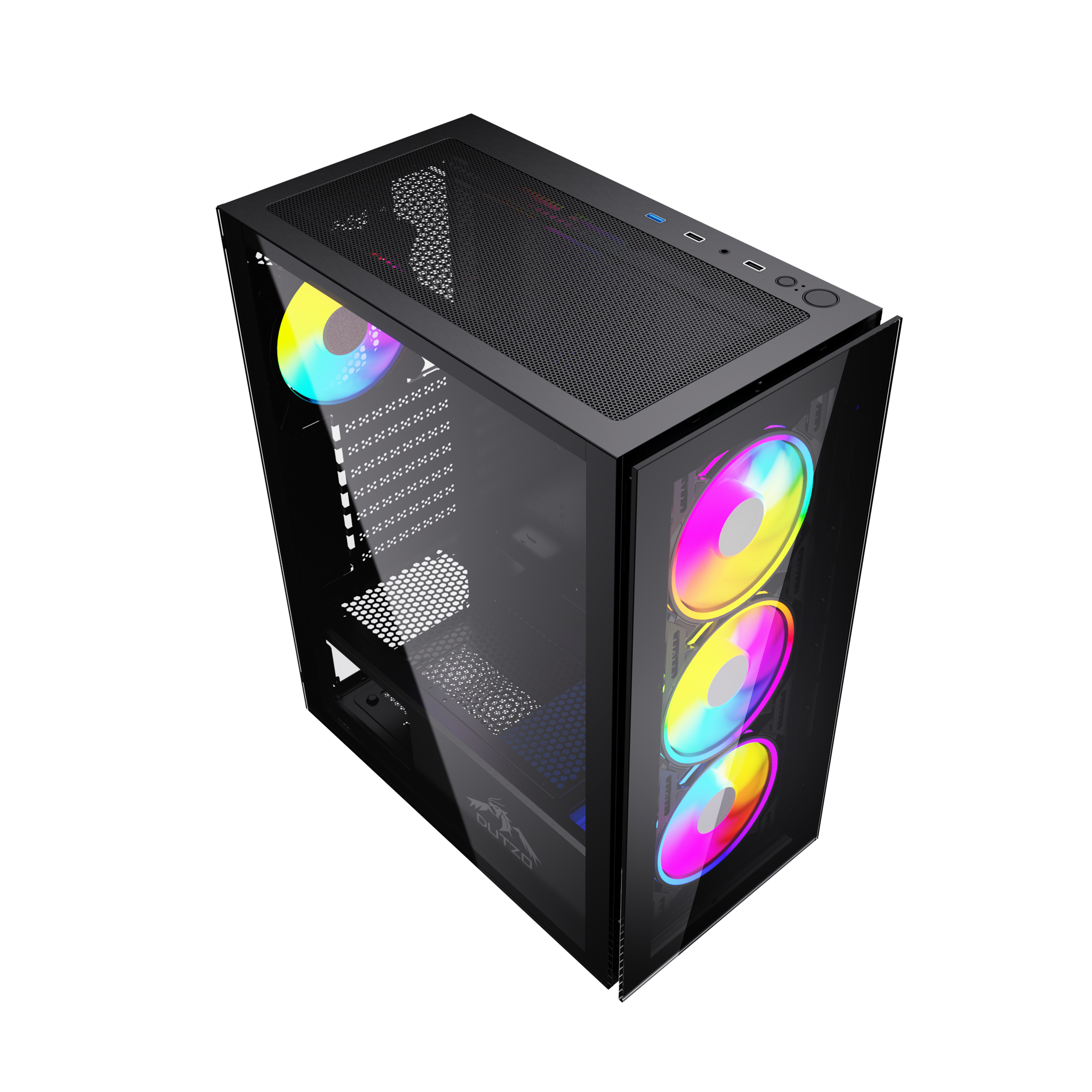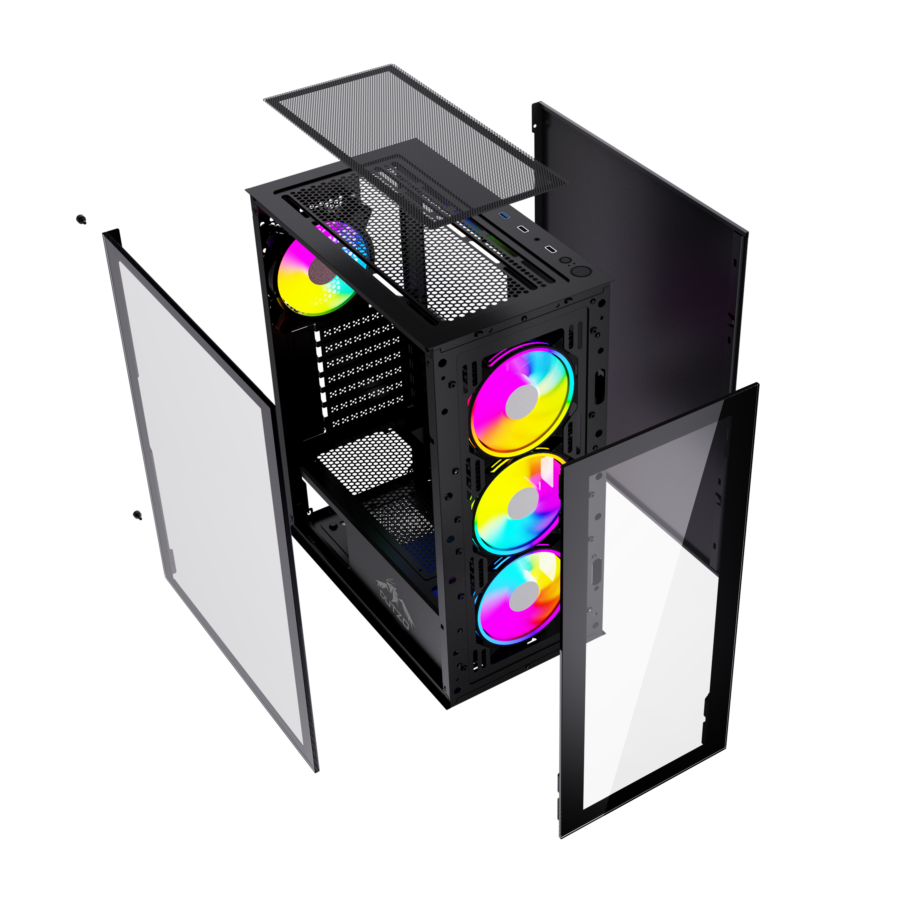 Miditower, ATX, no power supply (supports ATX up to 170mm long), front with RGB switch, 1 x USB 2.0, 1 x USB 3.0 & audio connections, 2 x 2.5" / 2 x 2.5"/3.5" drive bays, RGB Controller, watercooling: supports up to 360mm radiator, GPU clearance: 33 cm, CPU cooler clearance: 165 mm, included case fans: 3 x 120mm front (RGB LED) / 1 x 120mm rear (RGB LED), with tempered glass side window & front, black with RGB DUTZO C530 is packed with 4 x RGB 120mm fans connected to our ARGB controller -