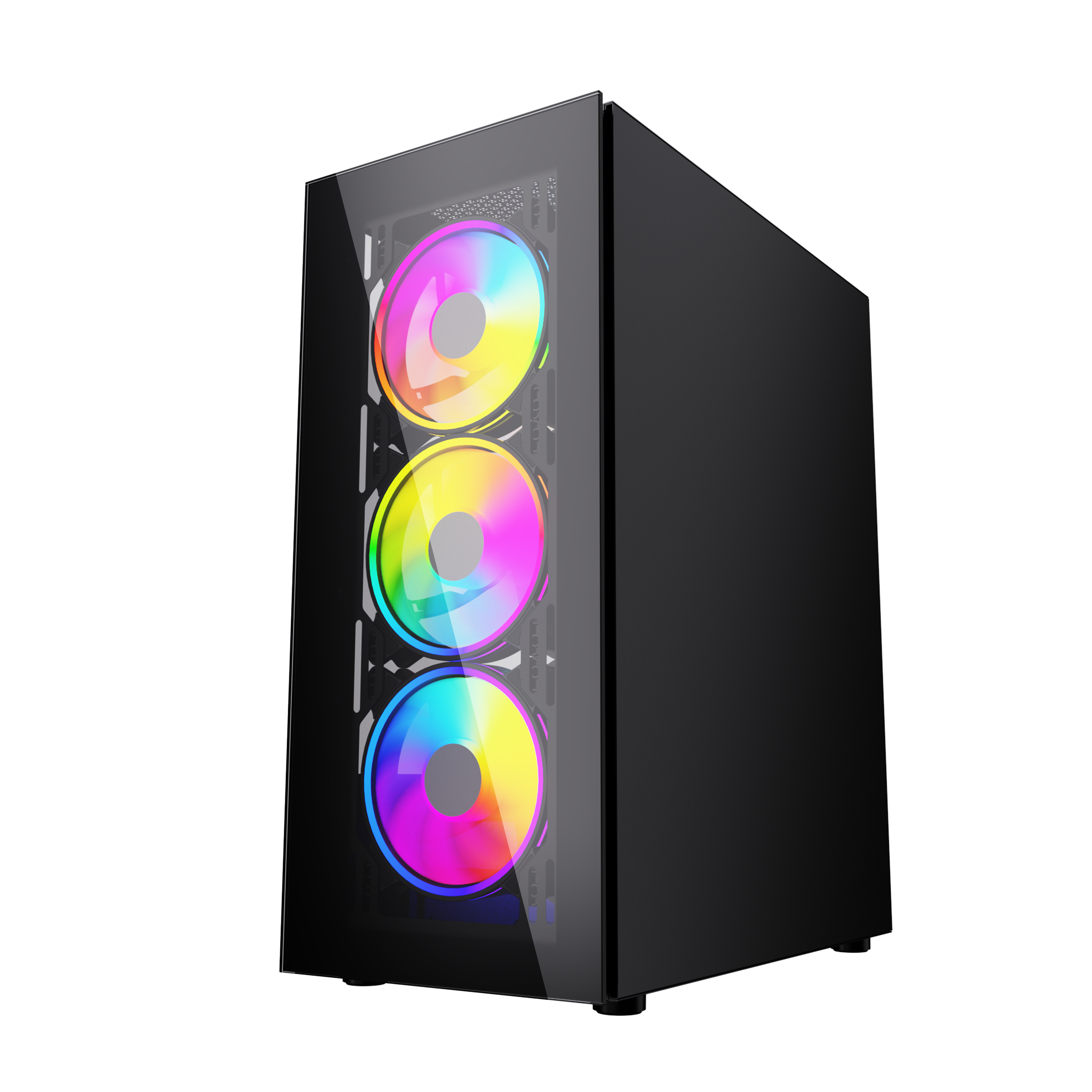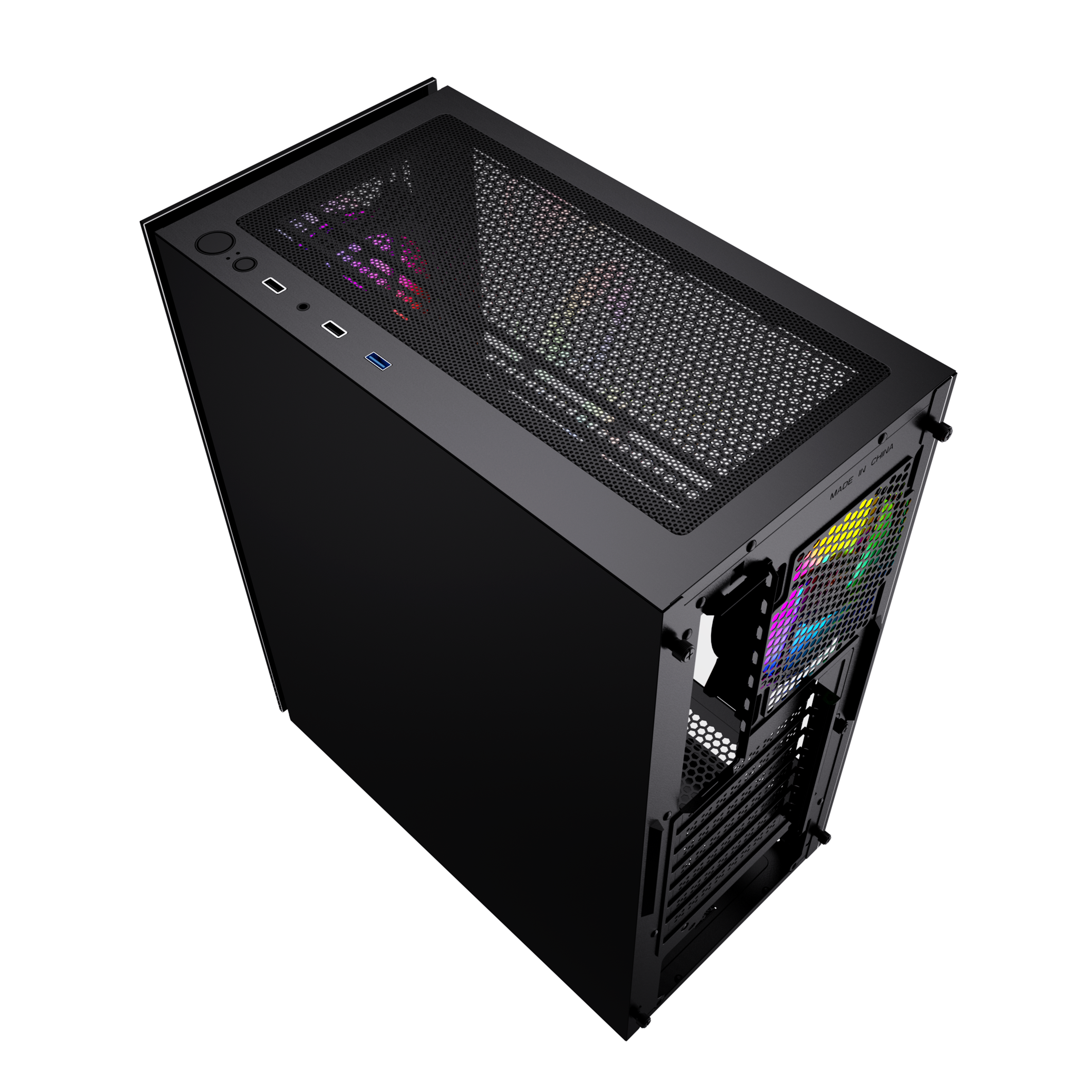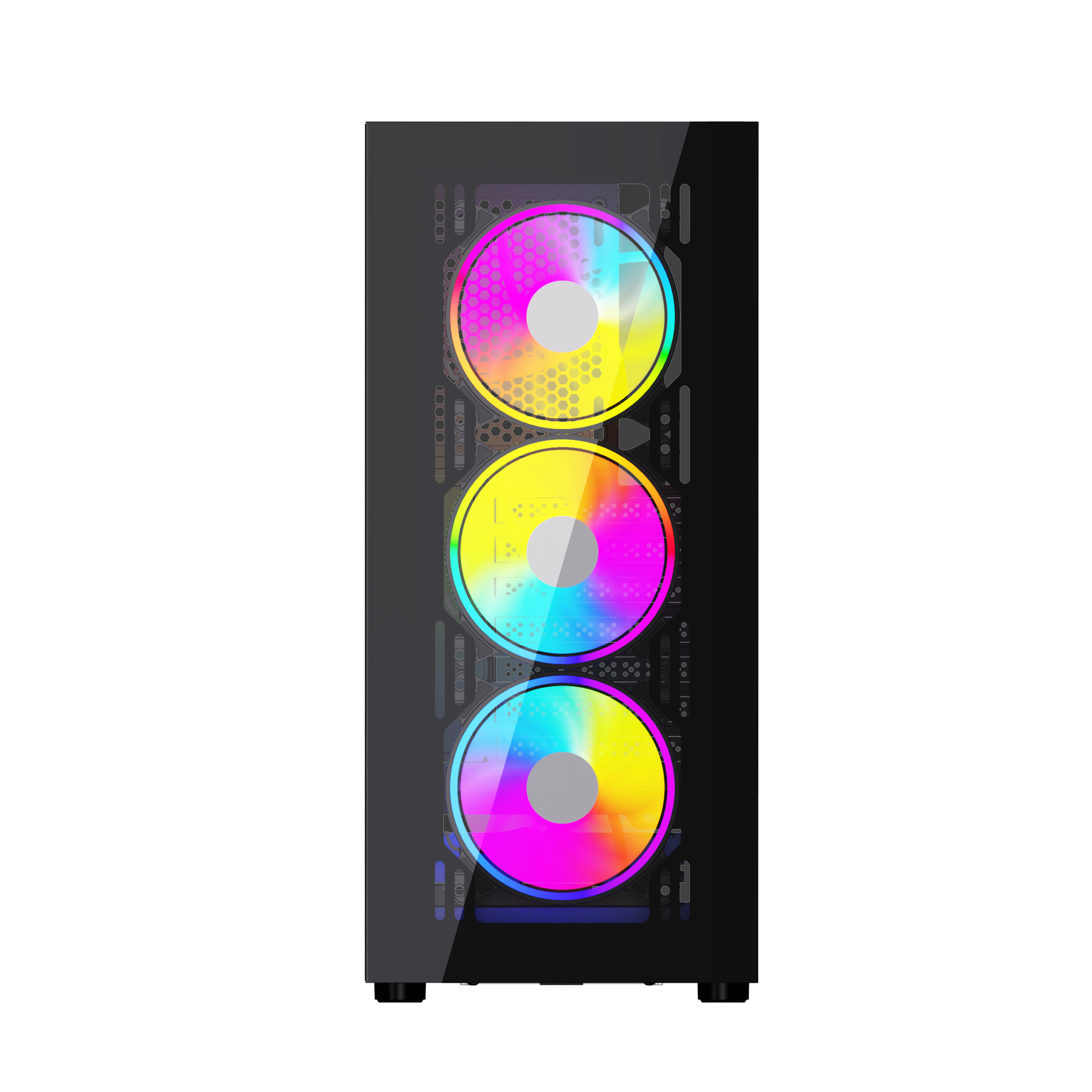 Miditower, ATX, no power supply (supports ATX up to 170mm long), front with RGB switch, 1 x USB 2.0, 1 x USB 3.0 & audio connections, 2 x 2.5" / 2 x 2.5"/3.5" drive bays, RGB Controller, watercooling: supports up to 360mm radiator, GPU clearance: 33 cm, CPU cooler clearance: 165 mm, included case fans: 3 x 120mm front (RGB LED) / 1 x 120mm rear (RGB LED), with tempered glass side window & front, black with RGB DUTZO C530 is packed with 4 x RGB 120mm fans connected to our ARGB controller -