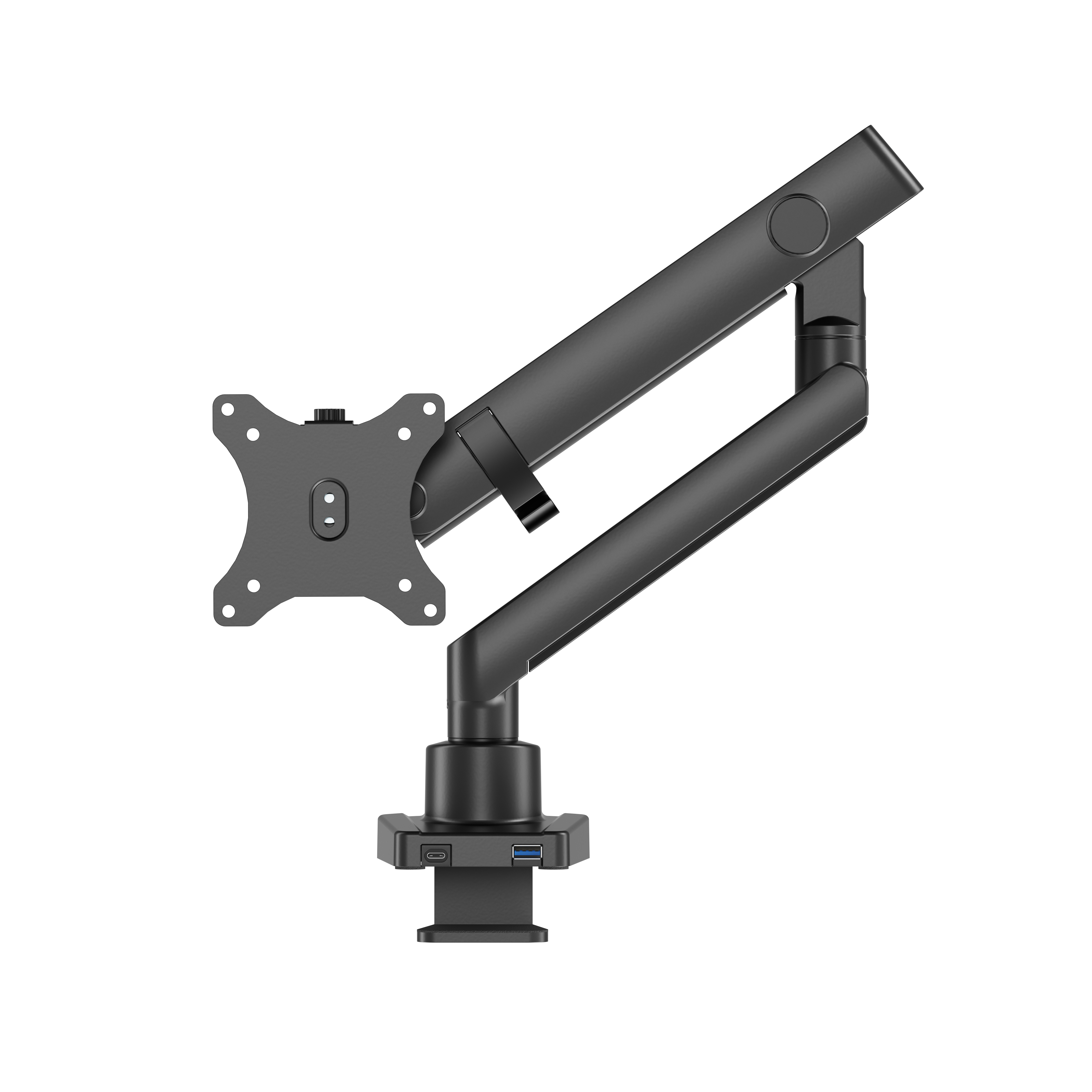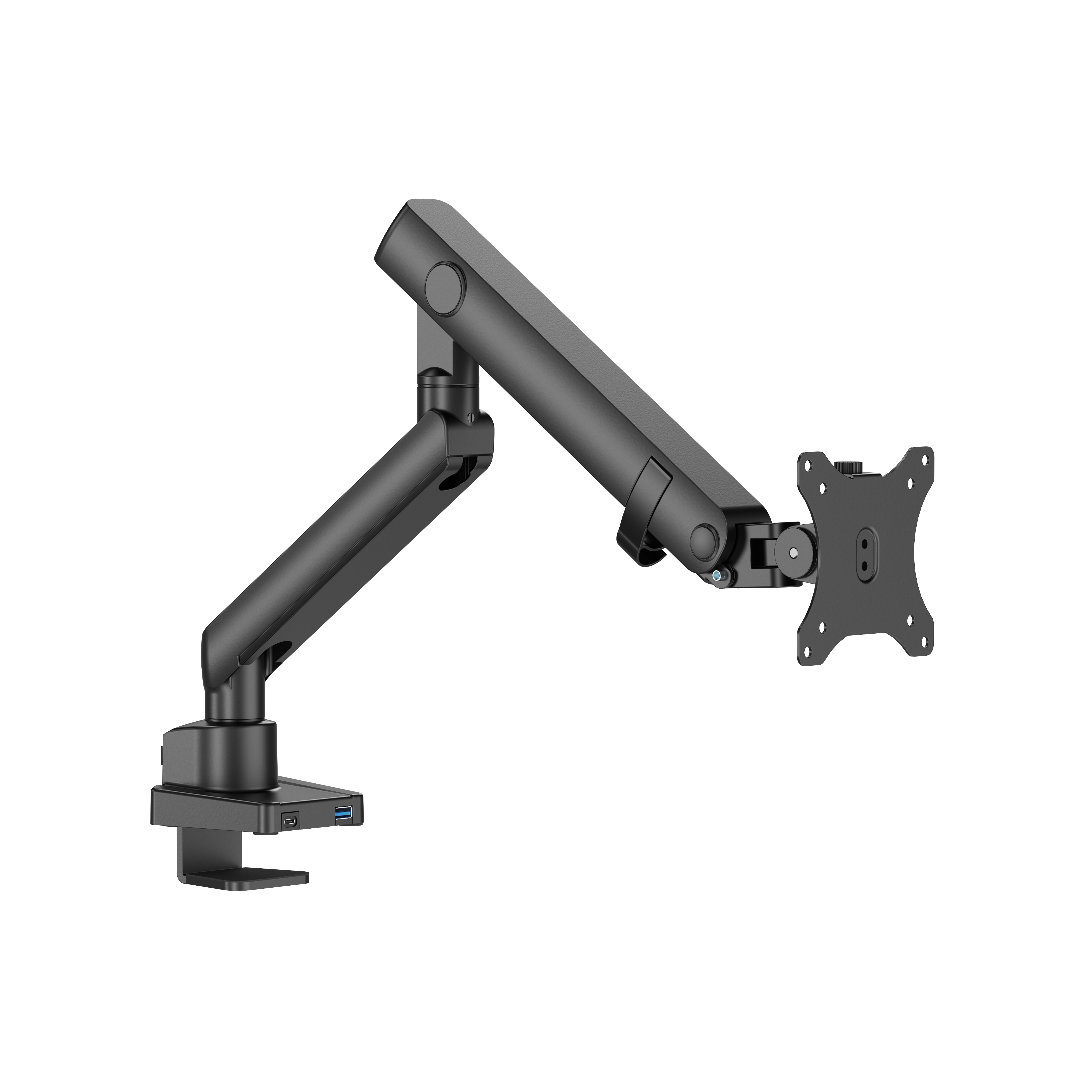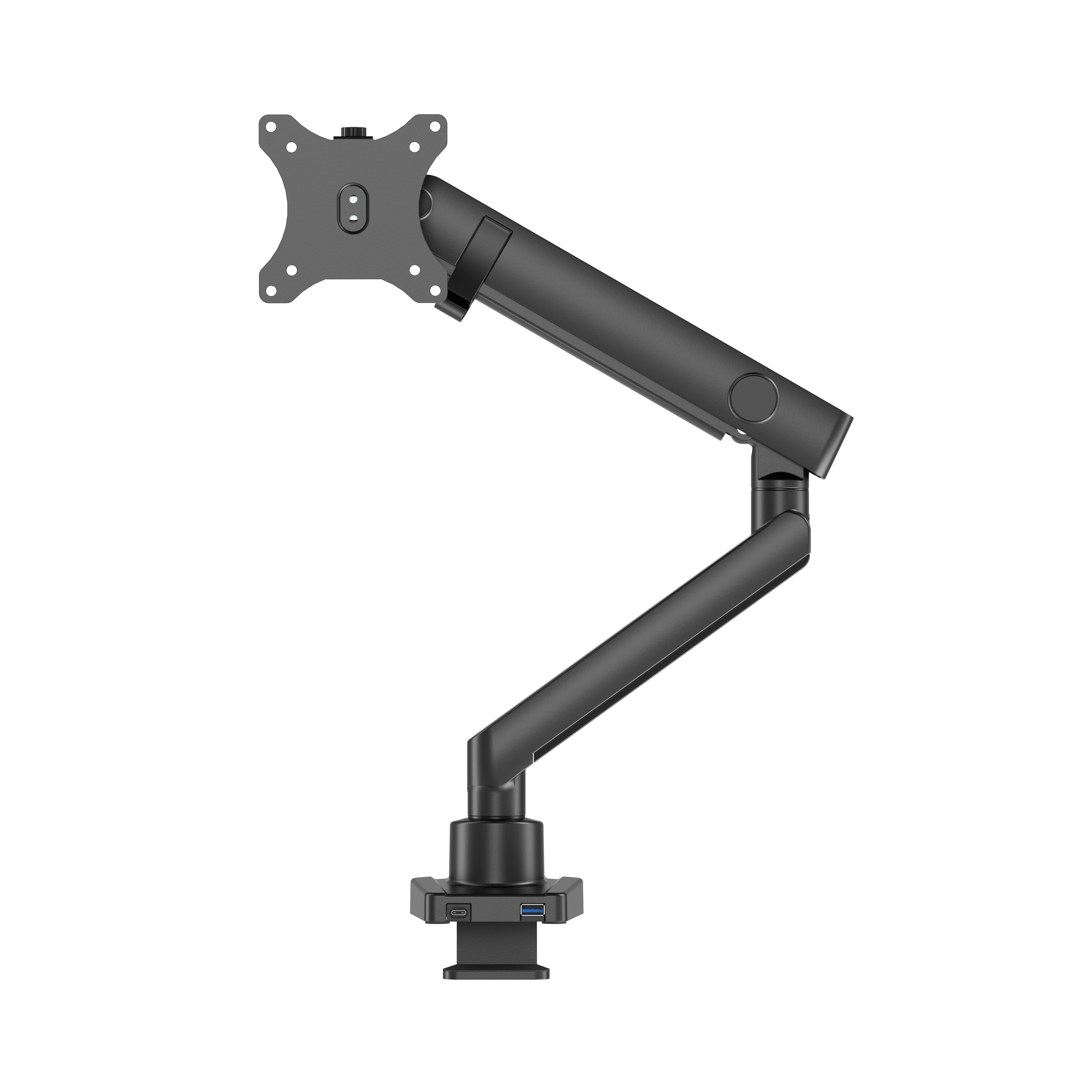 Flexible VESA Monitor Arm for 1 screen, suitable for screens between 17" and 40", max load per screen: 12 kg, supports VESA standards: 75x75 and 100x100, with 1 x USB A & 1 x USB C ports (requires connection to PC via 2 x USB ports), gray / black design.