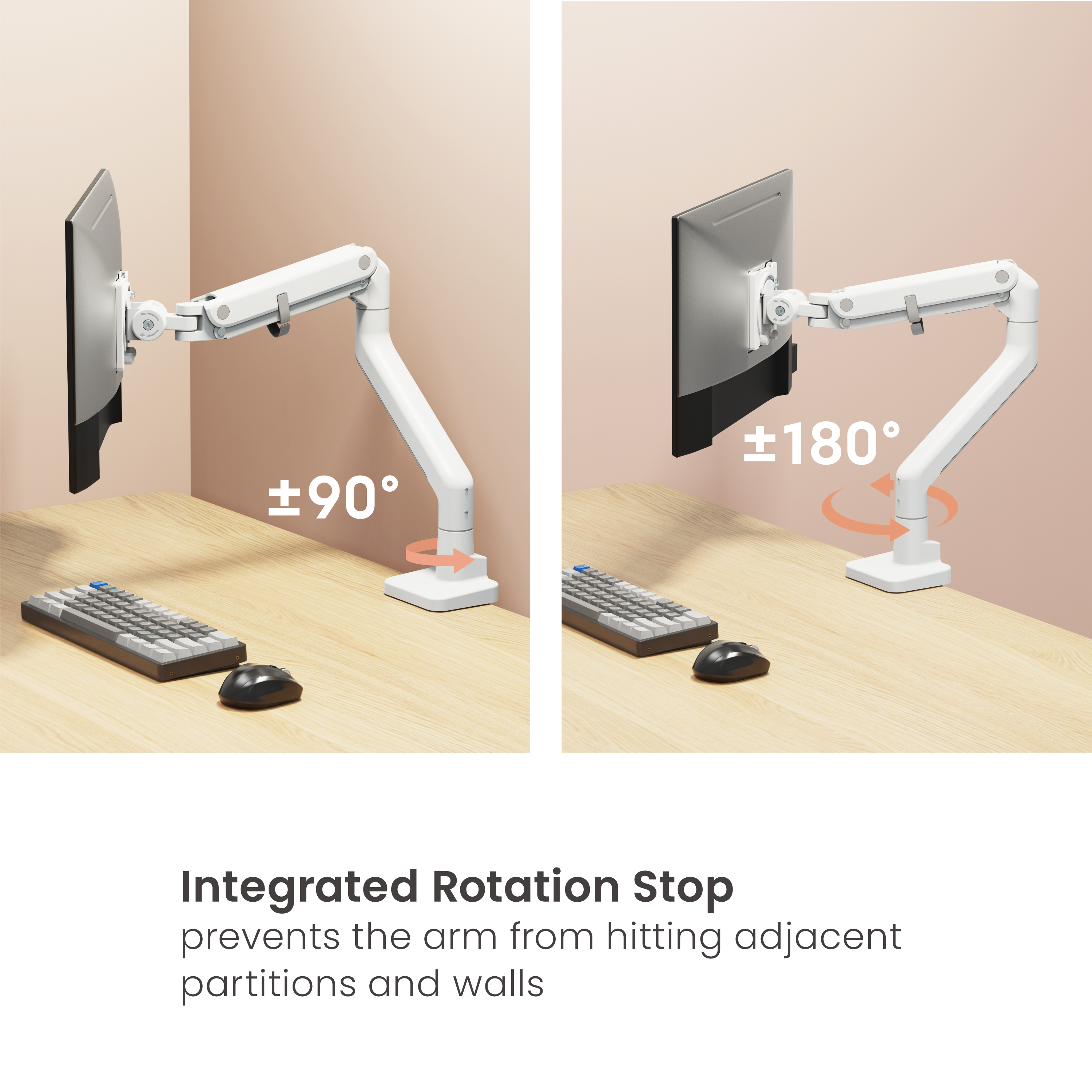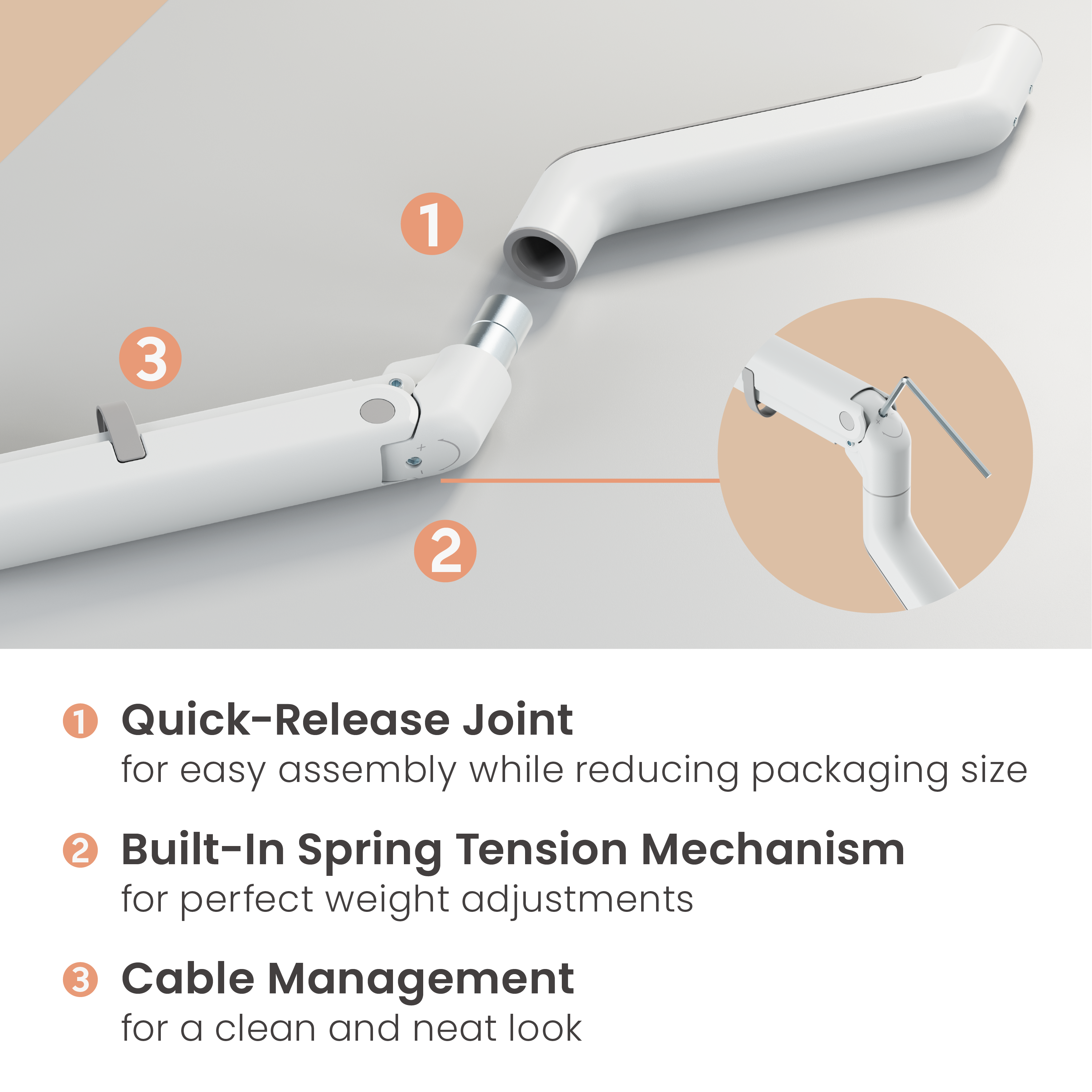Designed for modern work and gaming setups, this premium monitor arm combines advanced functionality with a clean, minimalist aesthetic. With its gas spring counterbalance mechanism, it allows you to easily adjust your monitor's height and angle for maximum comfort and productivity throughout the day.