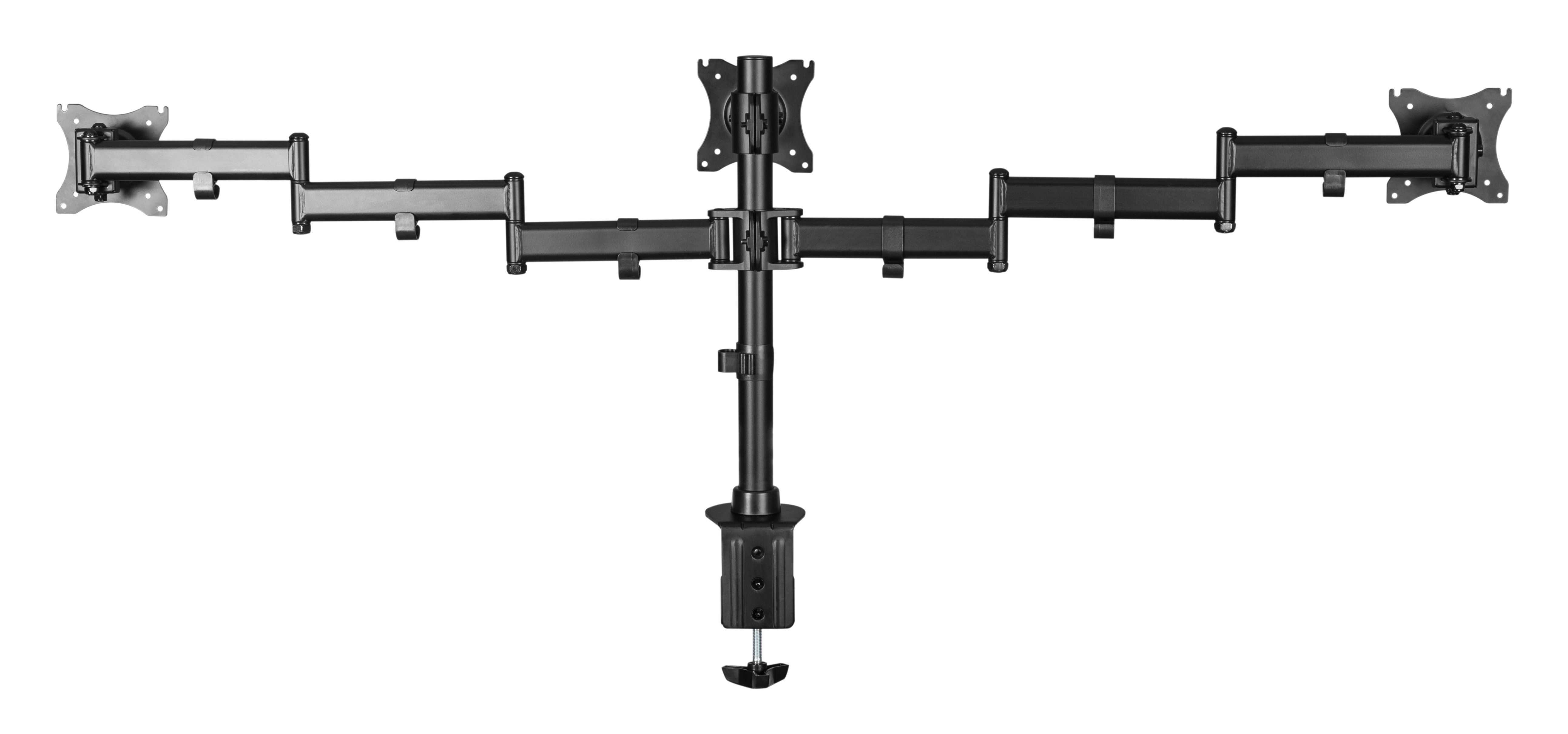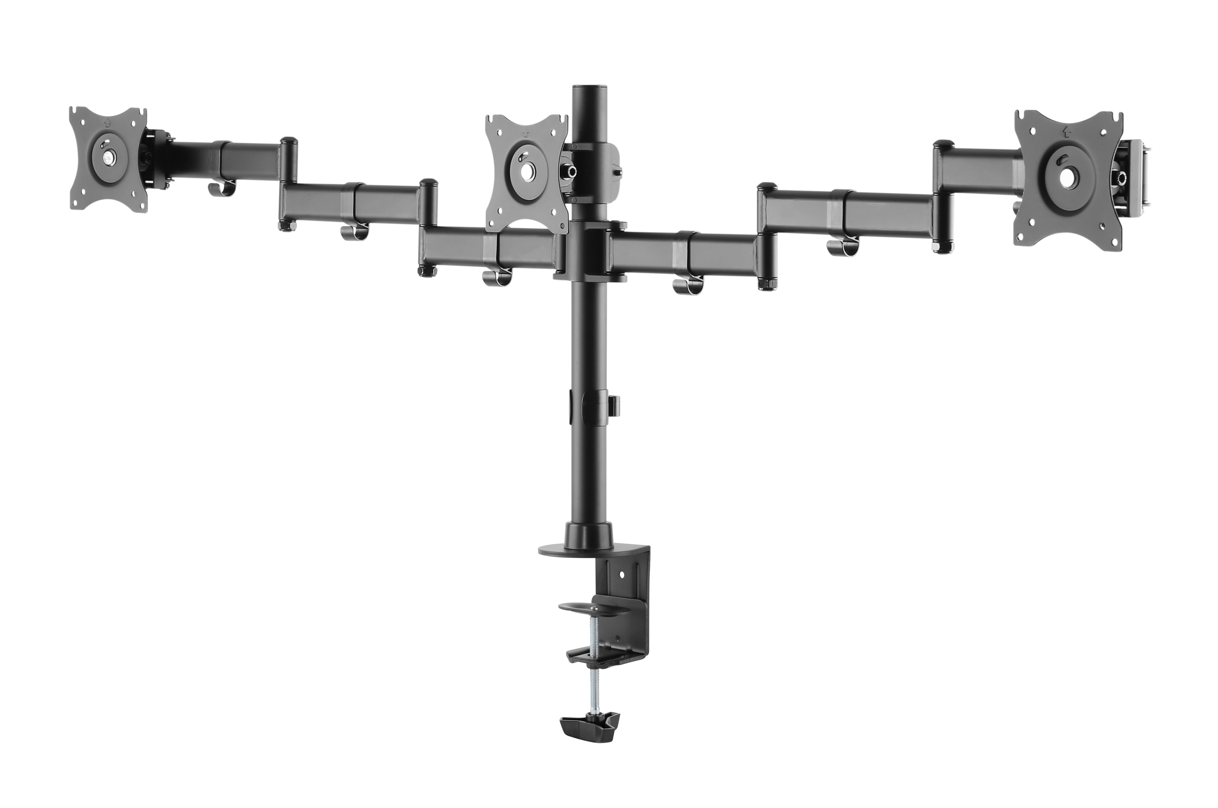 Fixed VESA monitor arm for 3 monitors, fits screens between 17" and 27", max load per screen: 8 kg, supports VESA standards: 75x75 and 100x100, black design.