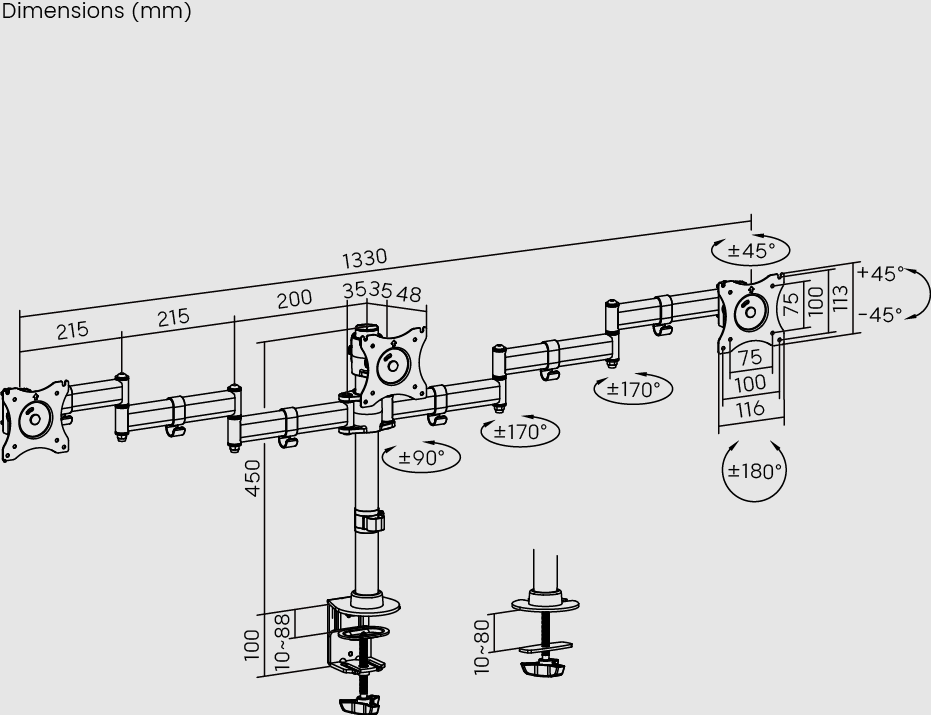 • Easy Installation: Compatible with VESA standards used on PC monitors (75x75mm and 100x100mm) and includes all necessary installation equipment, making setup quick and hassle-free. Supports mounting with clamp brackets attached to the back of the desk.